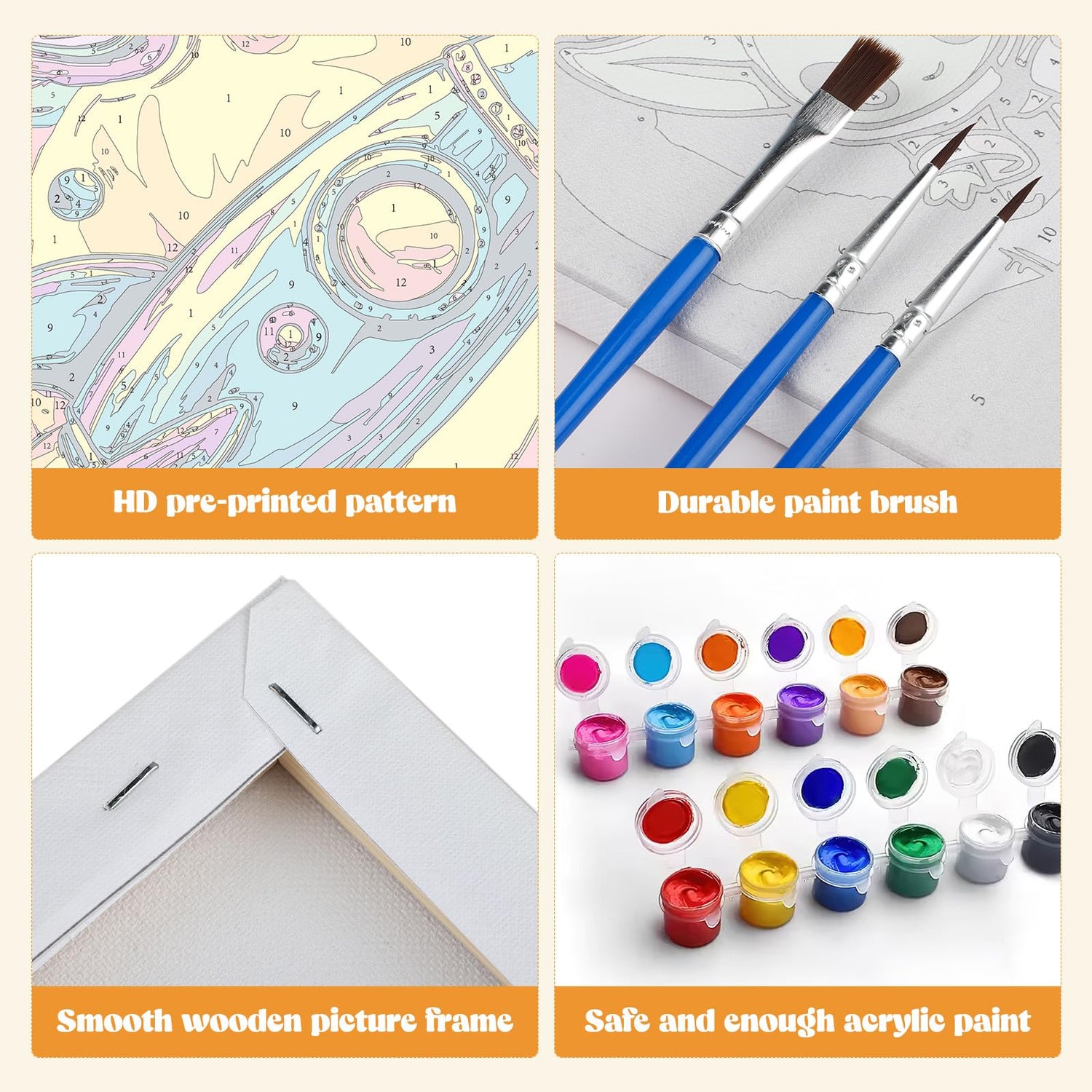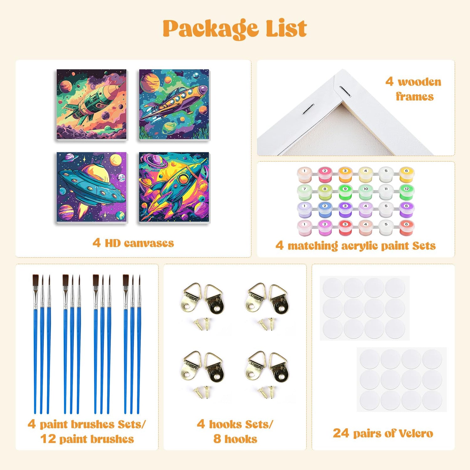 - Complete All-in-One Kit: Paint by number kit Includes 4 pre-printed canvases (with frames), 12 premium brushes, 4 matching acrylic paint sets, 8 hooks and 24 pairs of Velcro—everything needed to get started right away.