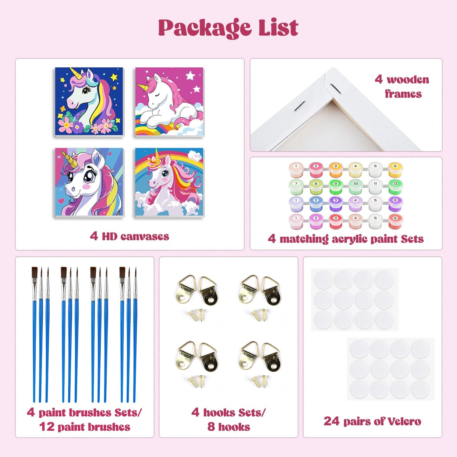 MXJSUA 4 Pack Cartoon Unicorn Paint by Numbers Kit with Framed Canvas for Kids, Rainbow Unicorn by Number Painting Kits for Ages 6-12 Kids, Acrylic Oil Paint by Number Kits for Beginners 8x8 Inch