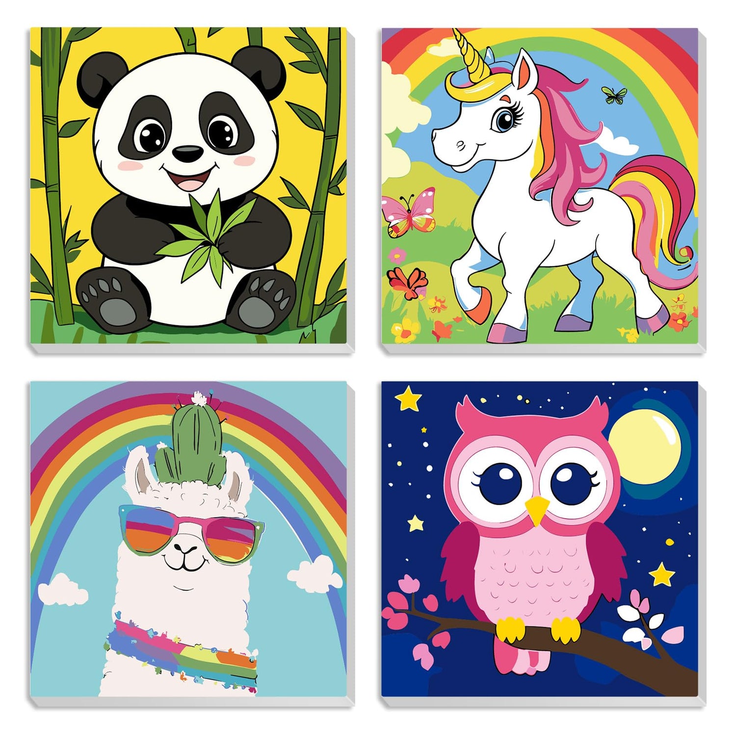 MXJSUA 4 Pack Cute Cartoon Animals Paint by Numbers Kit with Framed Canvas for Ages 6-12 Kids, Paint by Numbers Kits for Children Beginners, Acrylic Oil Painting for Home Wall Decor Gift (8x8 inch)
