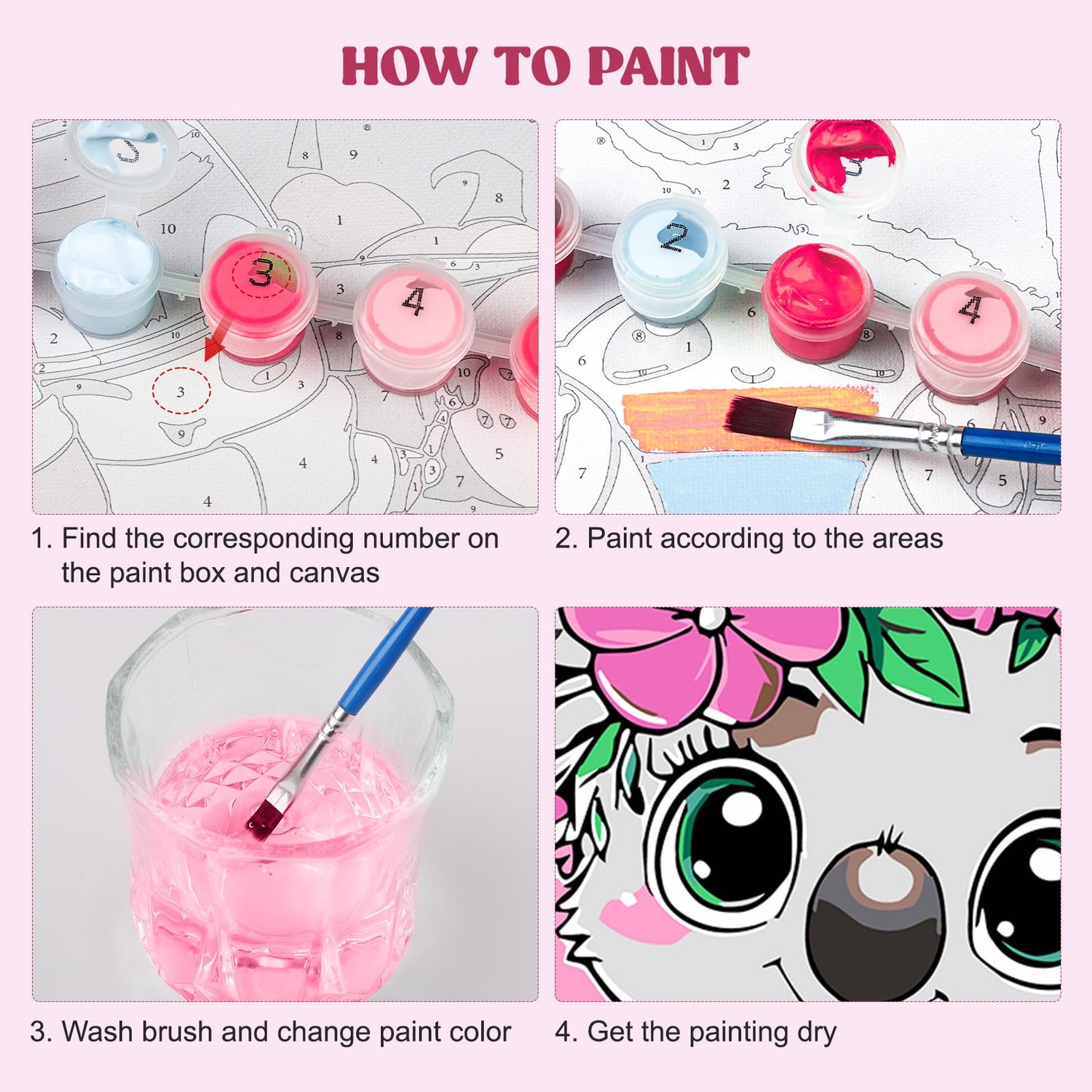 - Complete All-in-One Kit: Cute Animals Kids paint by number kit Includes 4 pre-printed canvases (with frames), 8 premium brushes, 4 matching acrylic paint sets and 24 pairs of Velcro—everything needed to get started right away.