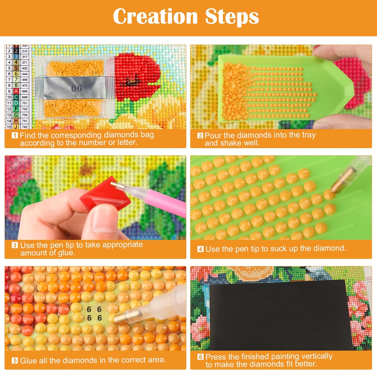 - Diamond Gem Art Painting Kits Contain All Necessary Tools: 1 high-definition canvas, 1 diamond tray, 1 big wax, 2 diamond pens, 1 replaceable correction pen, 5 ziplock bags, and enough round diamonds