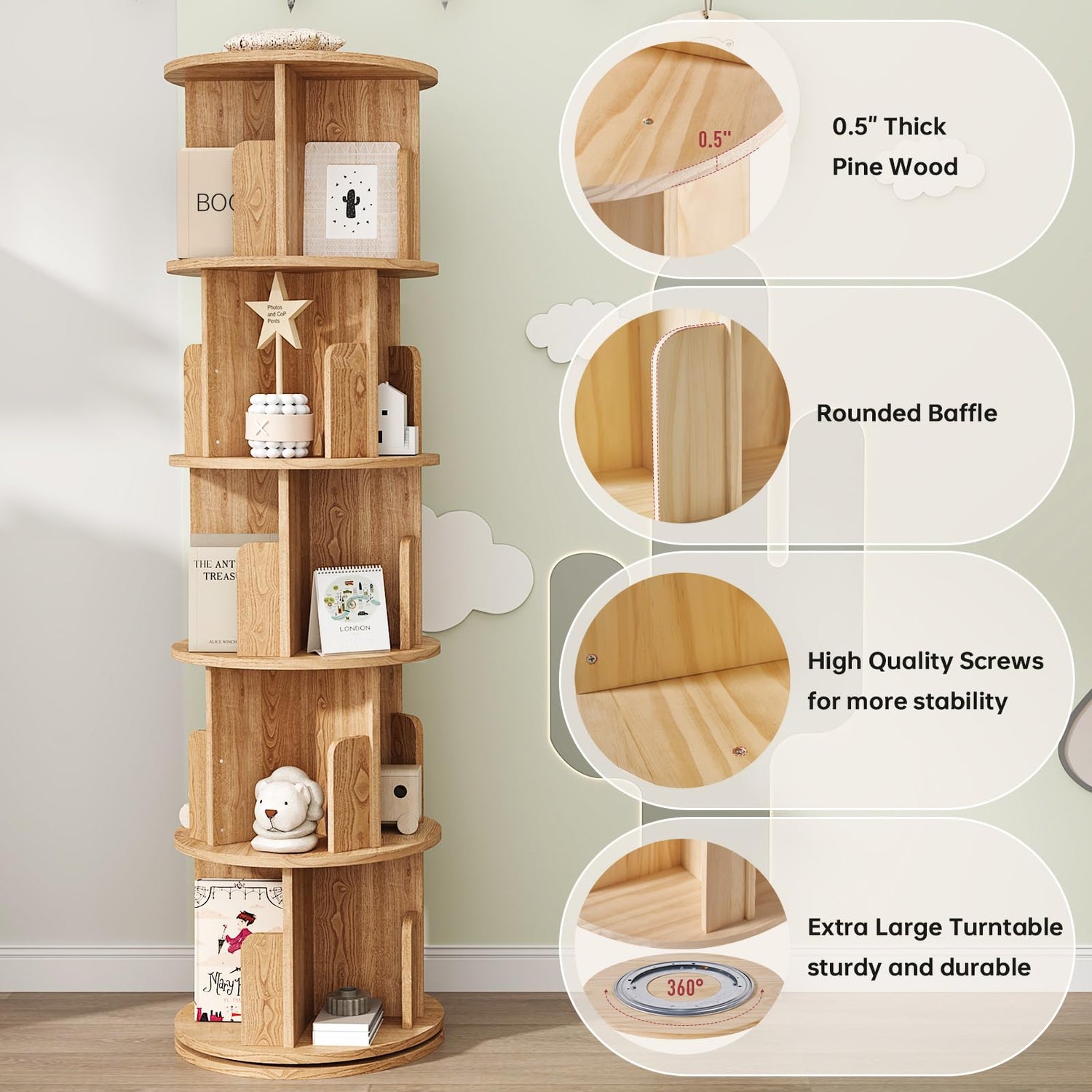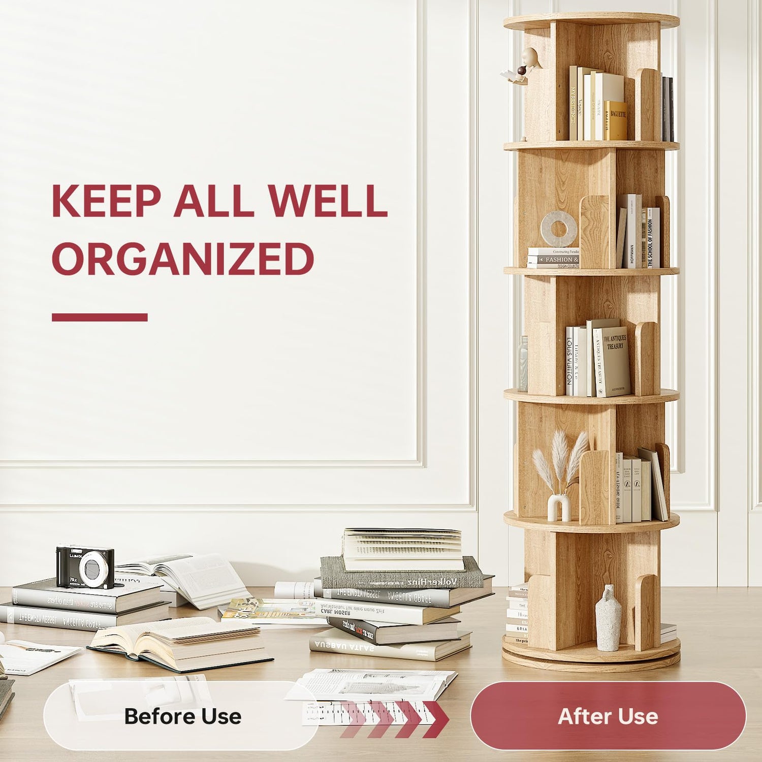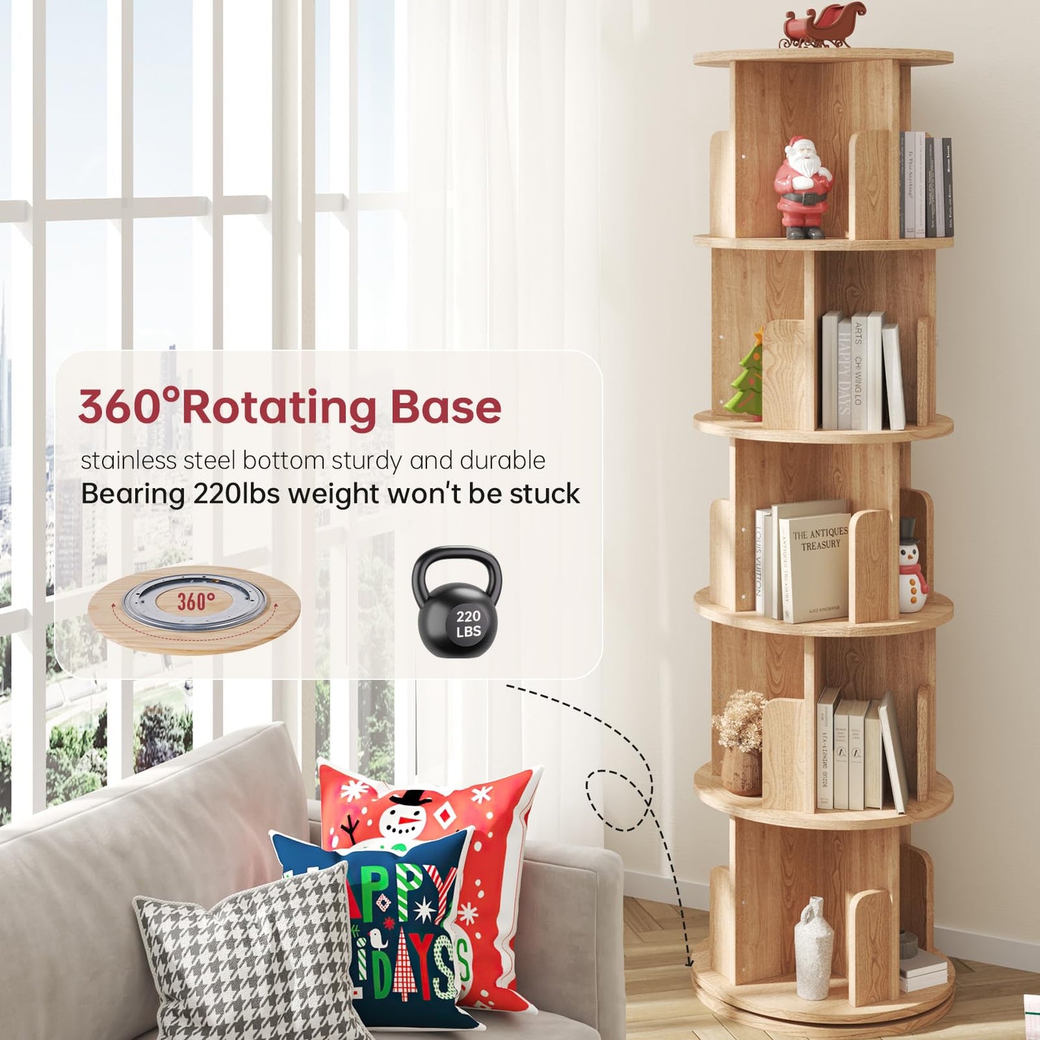 MXV Rotating Bookshelf, 360° Display 5 Tier Floor Standing Bookcase, Storage Rack for Kids&Adult, Multi-Functional Bookshelf Organizer for Bedroom, Study Room and Living Room