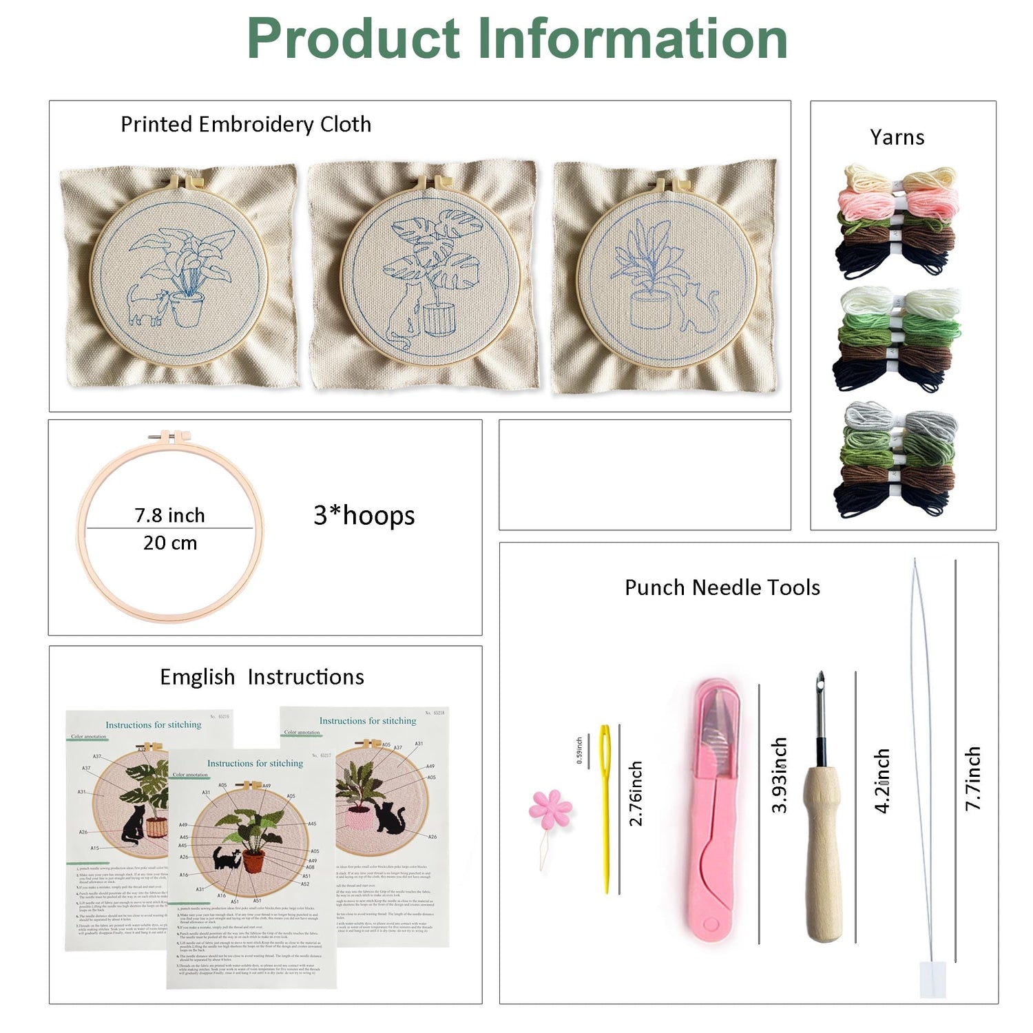 - Package content: 3* poking cloth with pattern, 3* plastic hoops, enough threads, 3* different needle threaders, 1* punching needle and a pair of scissors