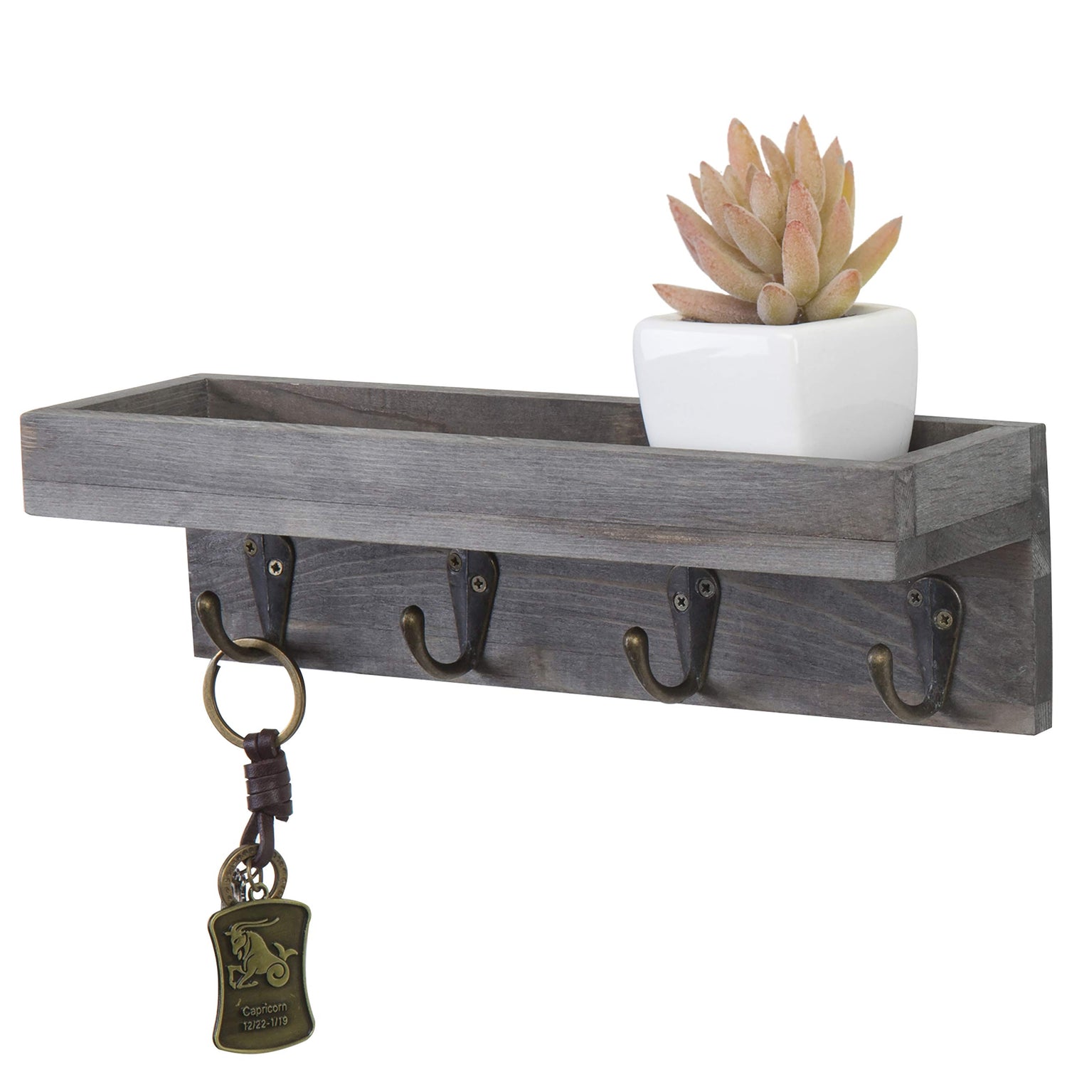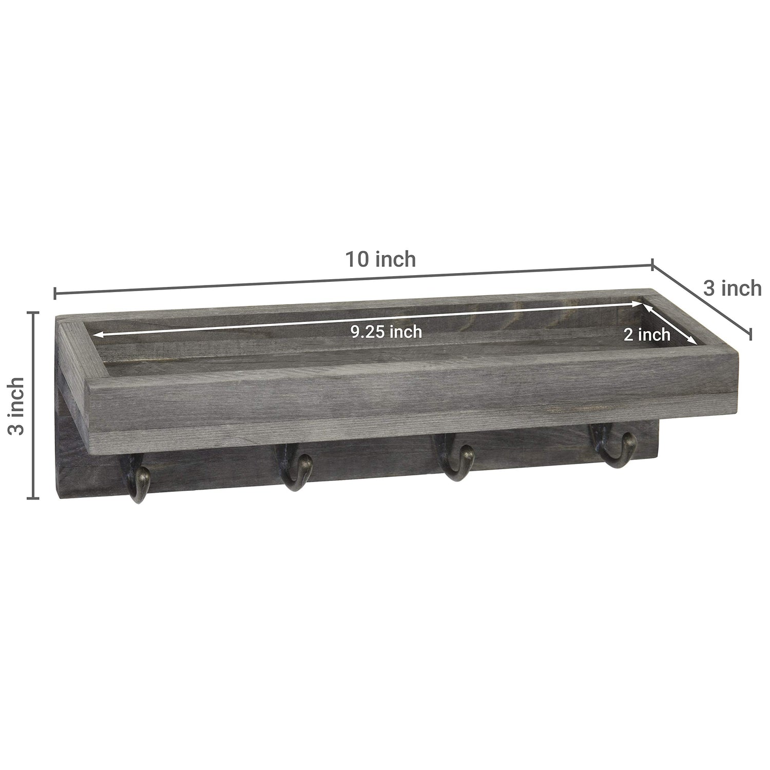 Details: Keep your entryway organized with this wall mounted vintage distressed gray wood storage rack. This display shelf features top space for storing personal and decorative items, and includes 4 antique metal hooks for hanging keys, coats, and leashes. Easy to mount to wall surfaces with proper hardware (Mounting hardware included), this shelf complements a variety of decors and is an excellent addition to your entryway in your home or office. **USPTO Patent Pending** SPECS: 10.0 W x 3.0 D x 3.0 H (in inches)