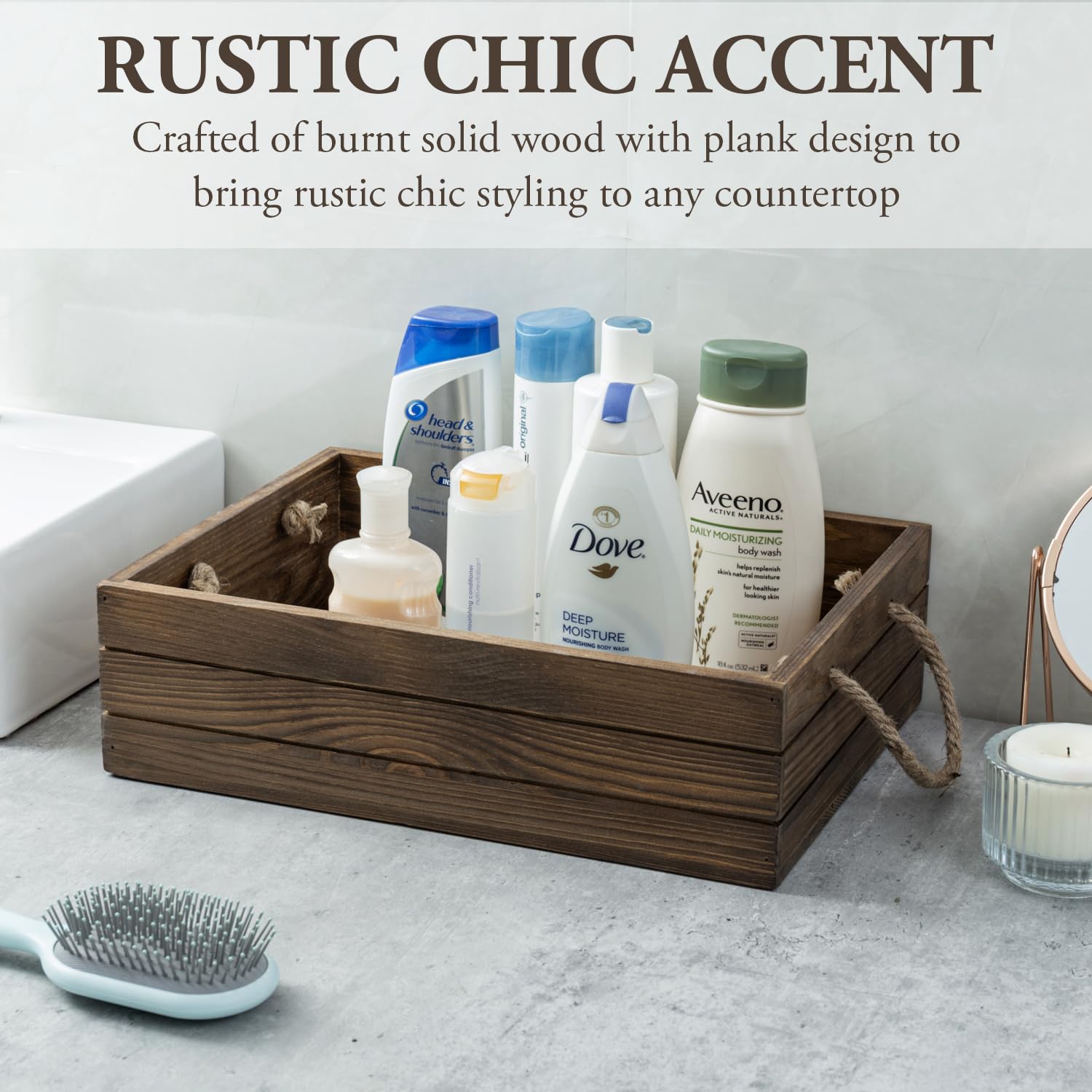MyGift 15 Inch Large Rustic Brown Solid Wood Decorative Storage Box with Rope Carrying Handles, Country Style Wooden Crate, Farmhouse Pallet Design Open Top Bin