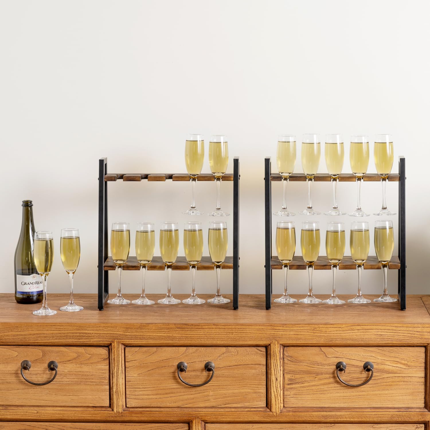 - Set of 2 wooden and metal tabletop stemware holders with 2 tiers hang champagne flute glasses for kitchen or bar counter display **Some assembly required**