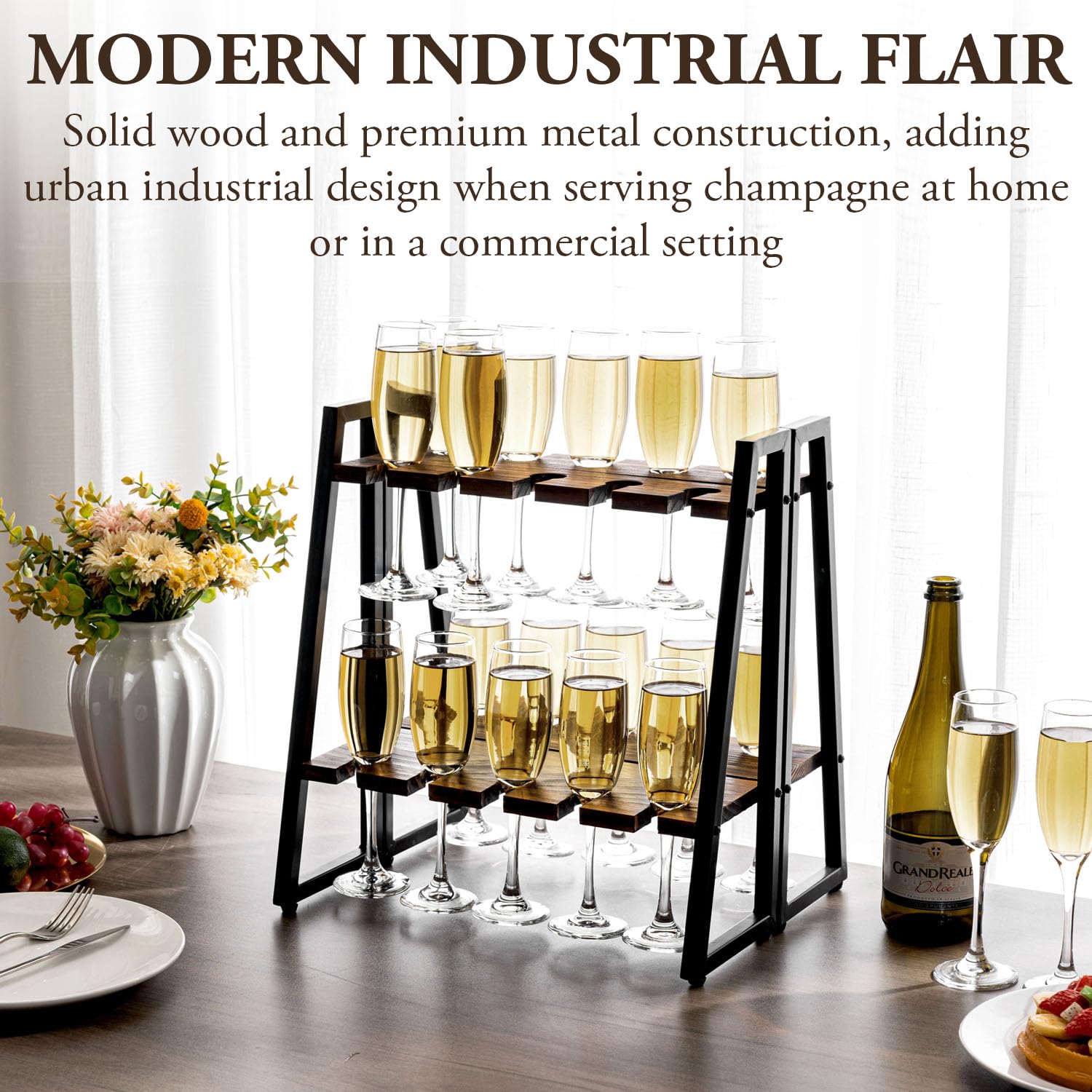 MyGift 2 Tier Rustic Brown Solid Wood Champagne Flute Stand with Industrial Matte Black Metal Frame, Tabletop Stemware Display Rack Fits up to 9 Inch Tall Glasses, Set of 2