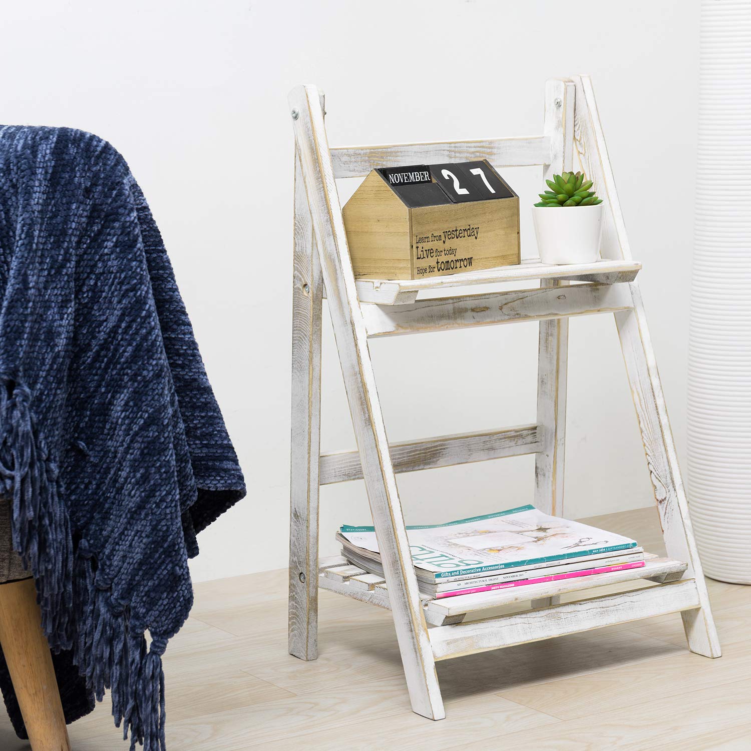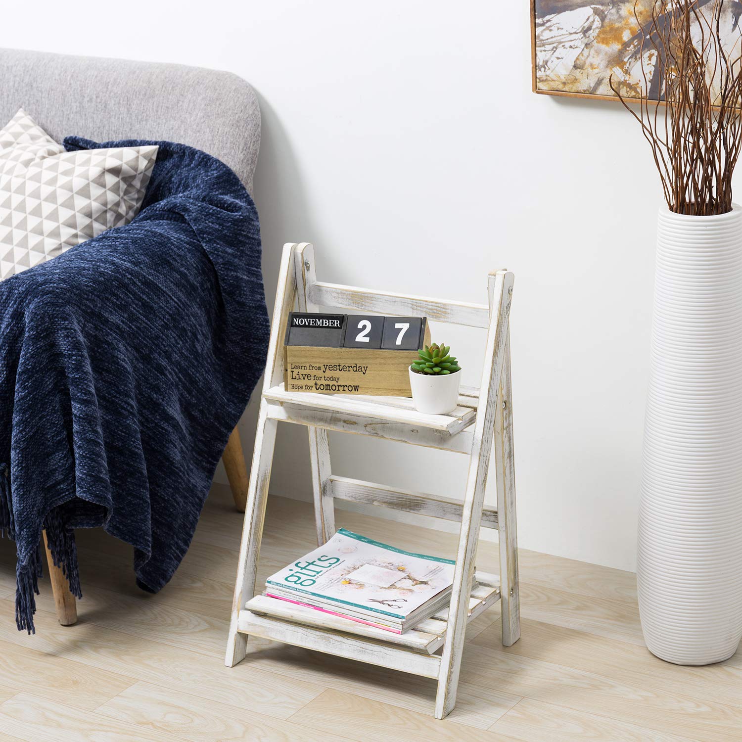 MyGift 2 Tier Rustic Whitewashed Solid Wood Freestanding Foldable Indoor Plant Stand, Decorative Wooden Display Shelf
