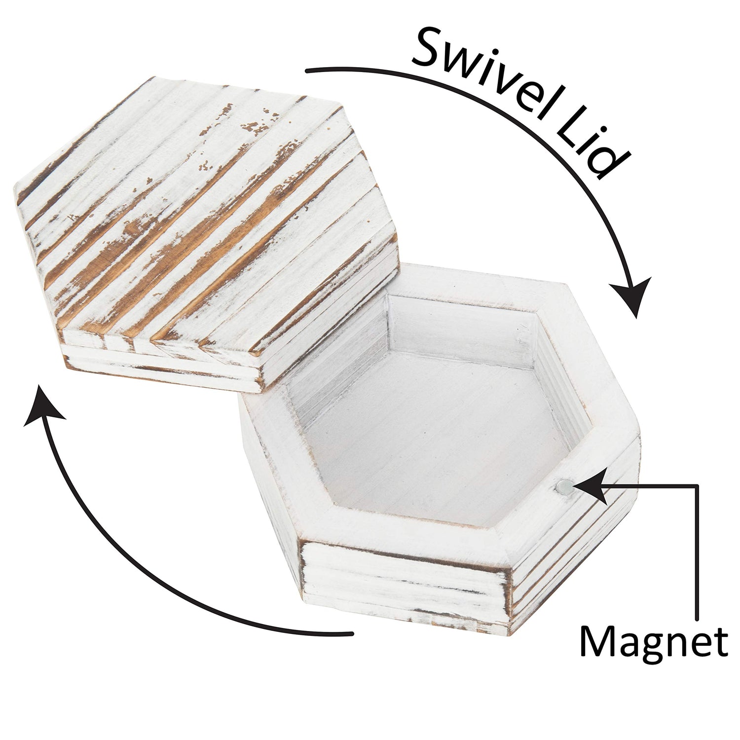 - 3-inch hexagonal whitewashed wood jewelry trinket box with swivel lid makes a beautifully traditional addition to your ring and jewelry storage