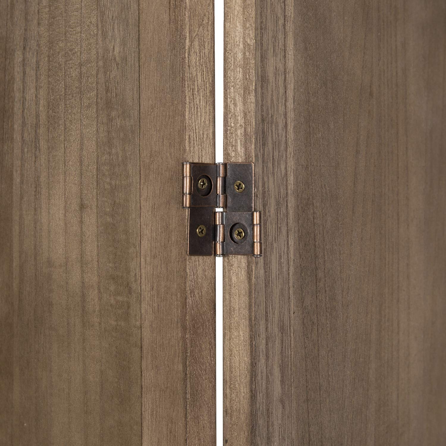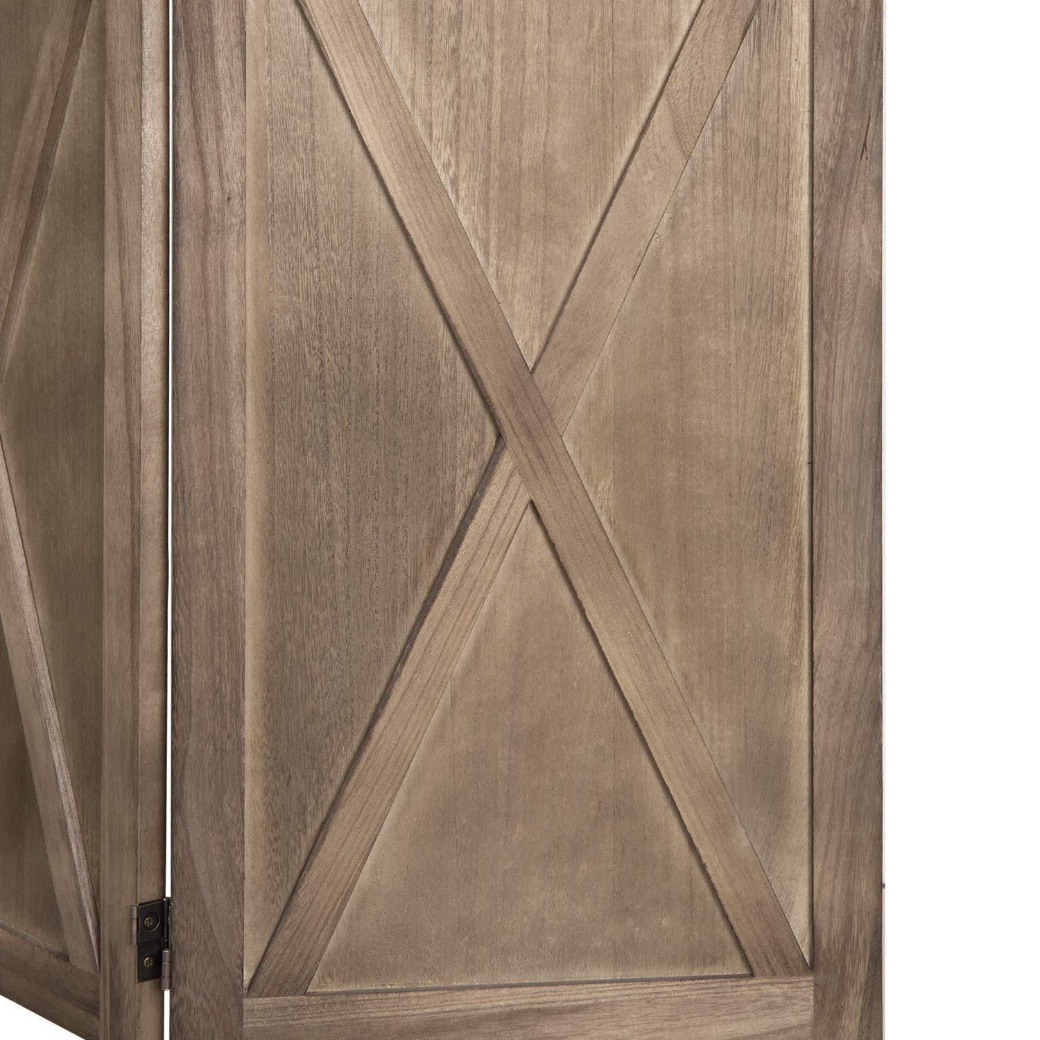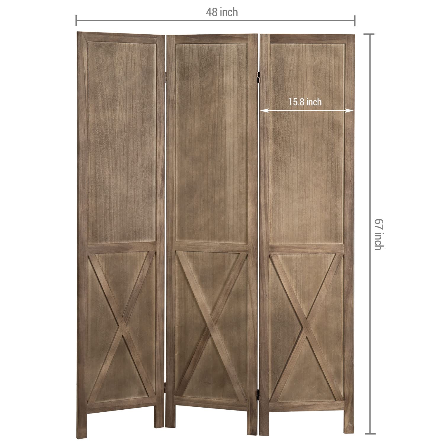 Details: Add a touch of farmhouse-inspired decoration to any living space with this 3 panel barn door style burnt wood room divider. Its sturdy, wide frame stands proudly upright and is great for sectioning off areas of large rooms, and can also be used as private changing screen. Dual-action hinges allow the panels of this room divider to be folded in either direction, allowing it to be displayed in a variety of positions, and can be easily folded up and put into storage when not in use.Approximate Dimensions: 67.0 H x 48.0 W x 0.7 D; Each Panel - 15.8 W (in inches)