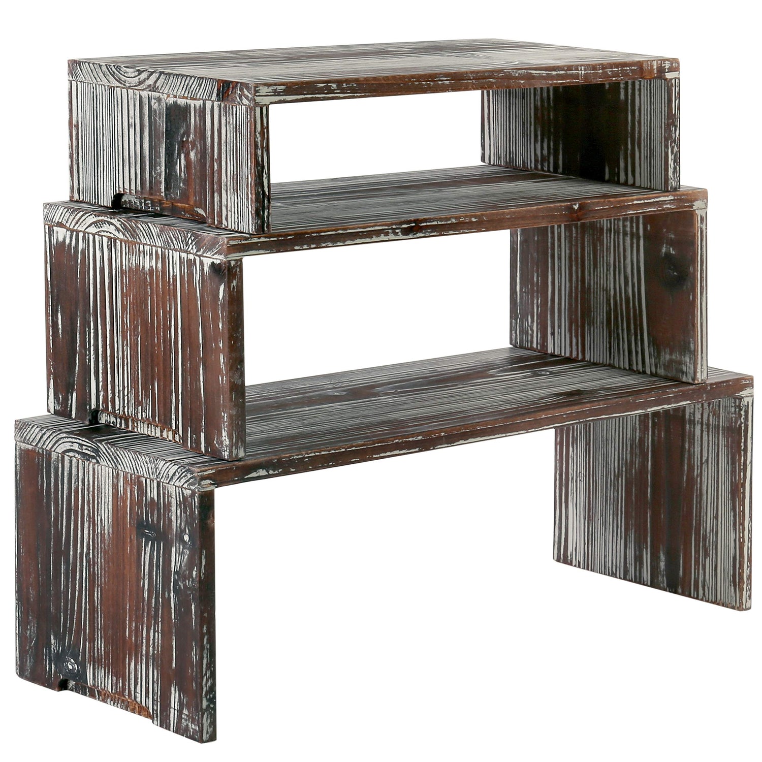 - 3-piece set of rectangular wooden tabletop nesting risers in a torched wood finish provide a decorative display for home, event venues, or retail merchandising