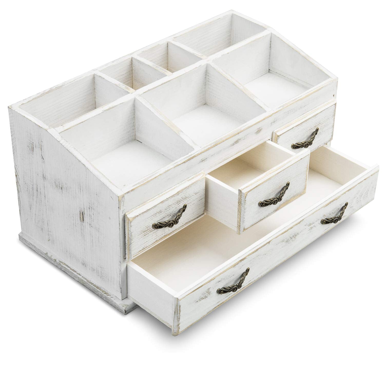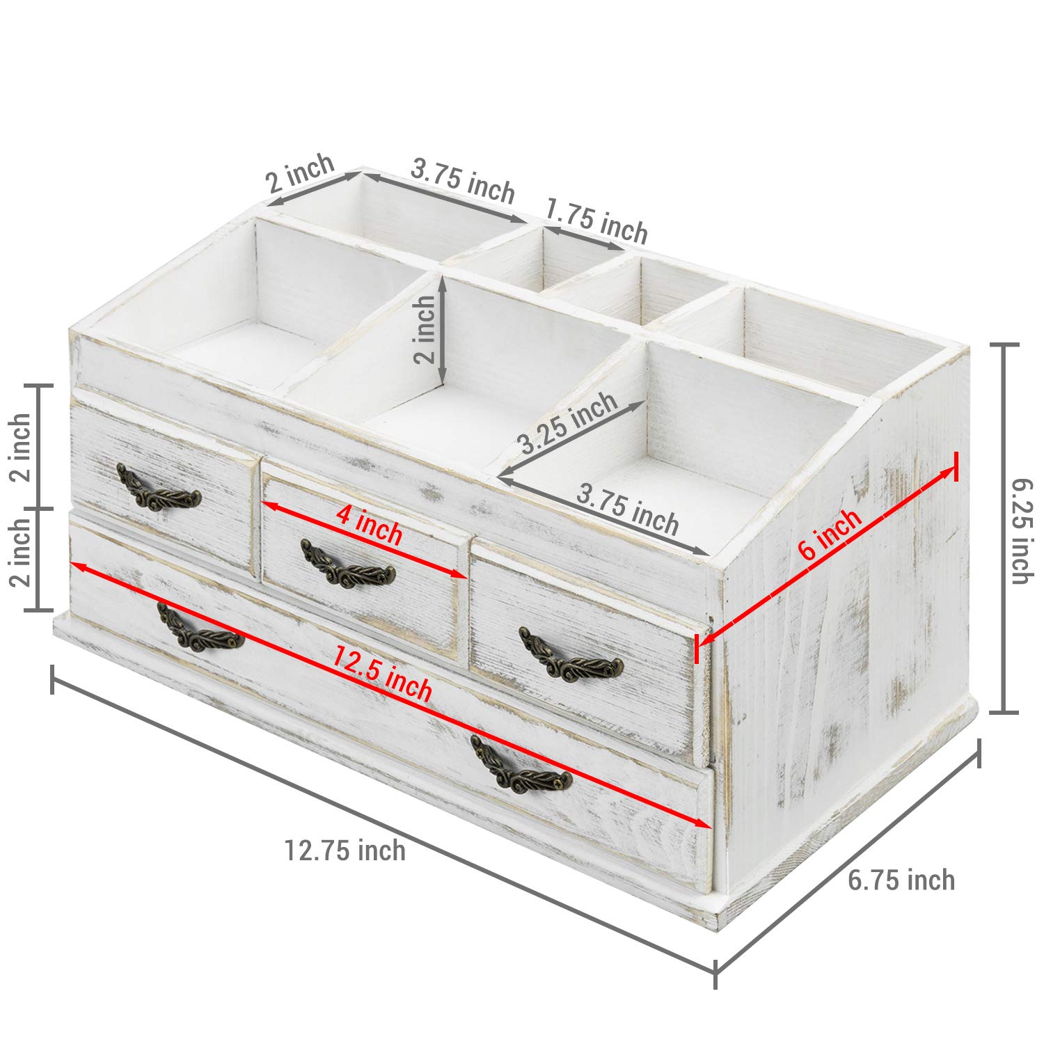 MyGift 7-Compartment Shabby Whitewashed Solid Wood Jewelry/Cosmetics Vanity Organizer Rack with 4 Vintage Storage Drawers