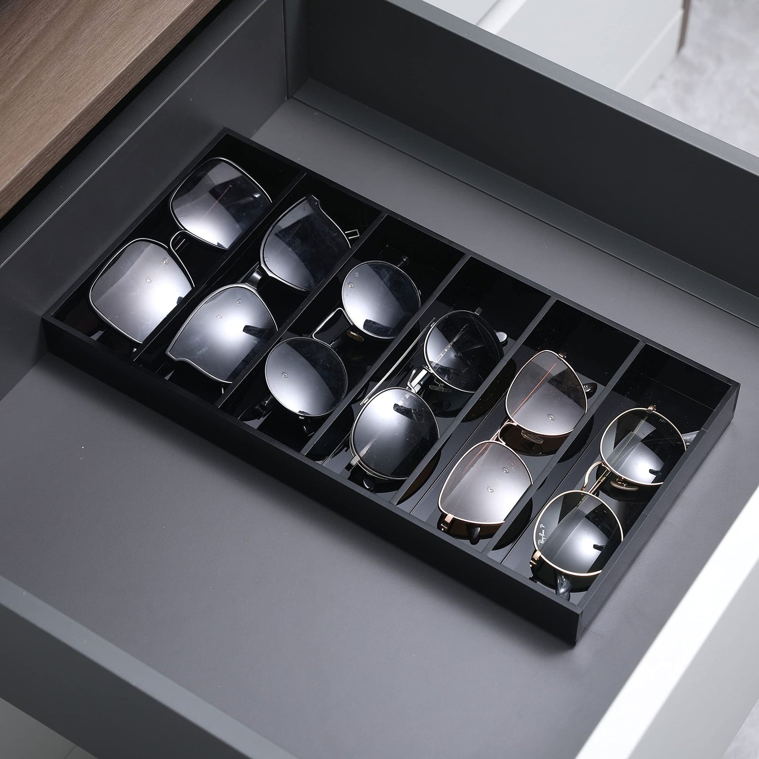 - 6 Individual Slots – Smart Structure for Efficient Storage Designed with 6 equal-sized compartments, this black glasses holder helps keep multiple items organized in one place. While it’s perfect for storing sunglasses, prescription glasses, or goggles (eyewear not included), it’s also a smart solution for separating jewelry, paper clips, cosmetics, or other small essentials without clutter