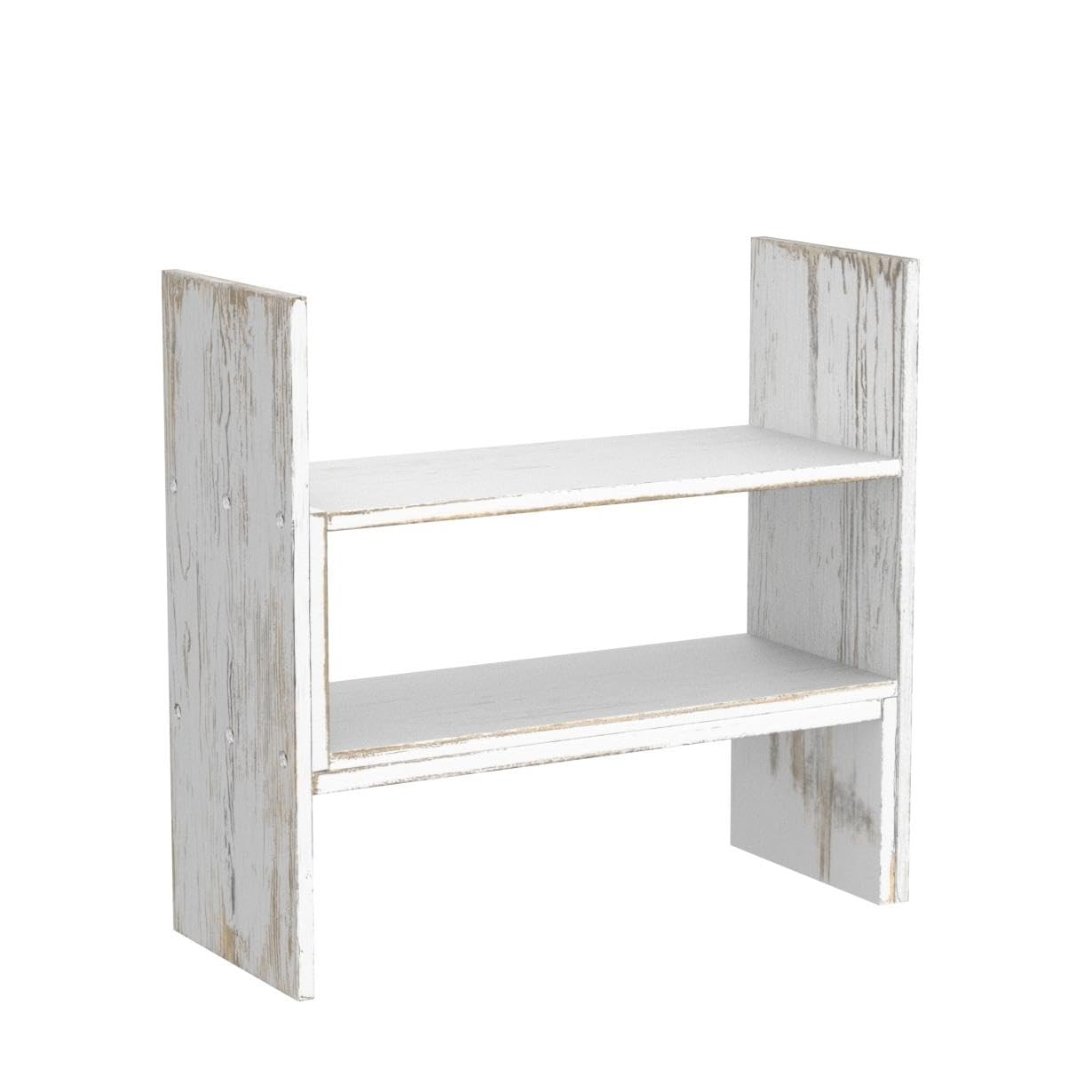Details: Compact, stylish, and versatile, this adjustable white washed wood shelf is ideal for adding organization and rustic flair to small spaces. This ultra stylish modern shelf is composed of two pieces-one resting on top of the other-that can be fully overlapped to make a shelf approximately 16 inches wide; or pulled apart to nearly double the width. The pieces can also be arranged at an angle to take advantage of unused corner spaces in cubicles or on countertops. Perfect for everything from books or office supplies, to kitchen spices or beauty products, place this convenient adjustable shelf in the kitchen, bathroom, workshop, or office to add needed storage to small spaces.