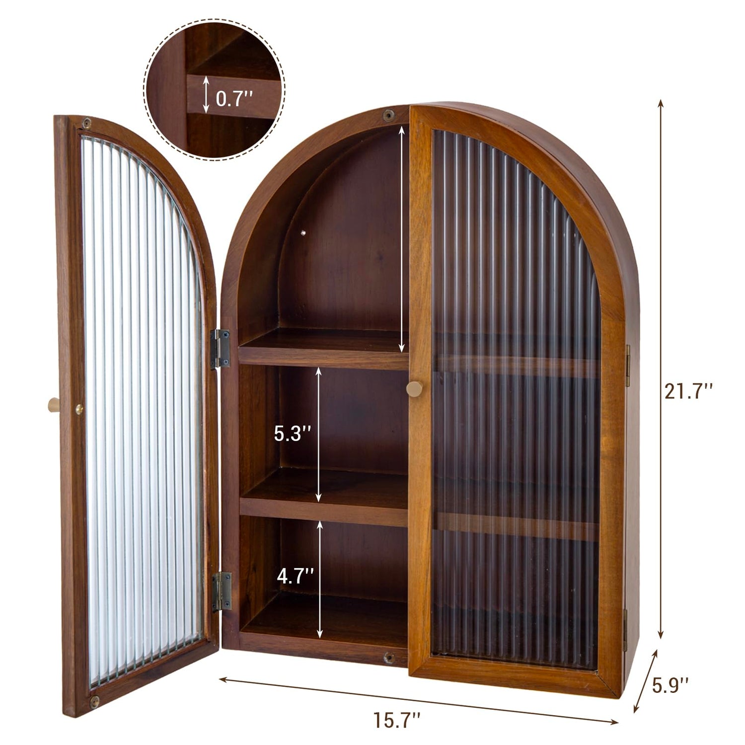 - Wall mounted medicine cabinet with a wooden arched design and two hinged doors that feature fluted glass panels, revealing 3 interior storage shelves