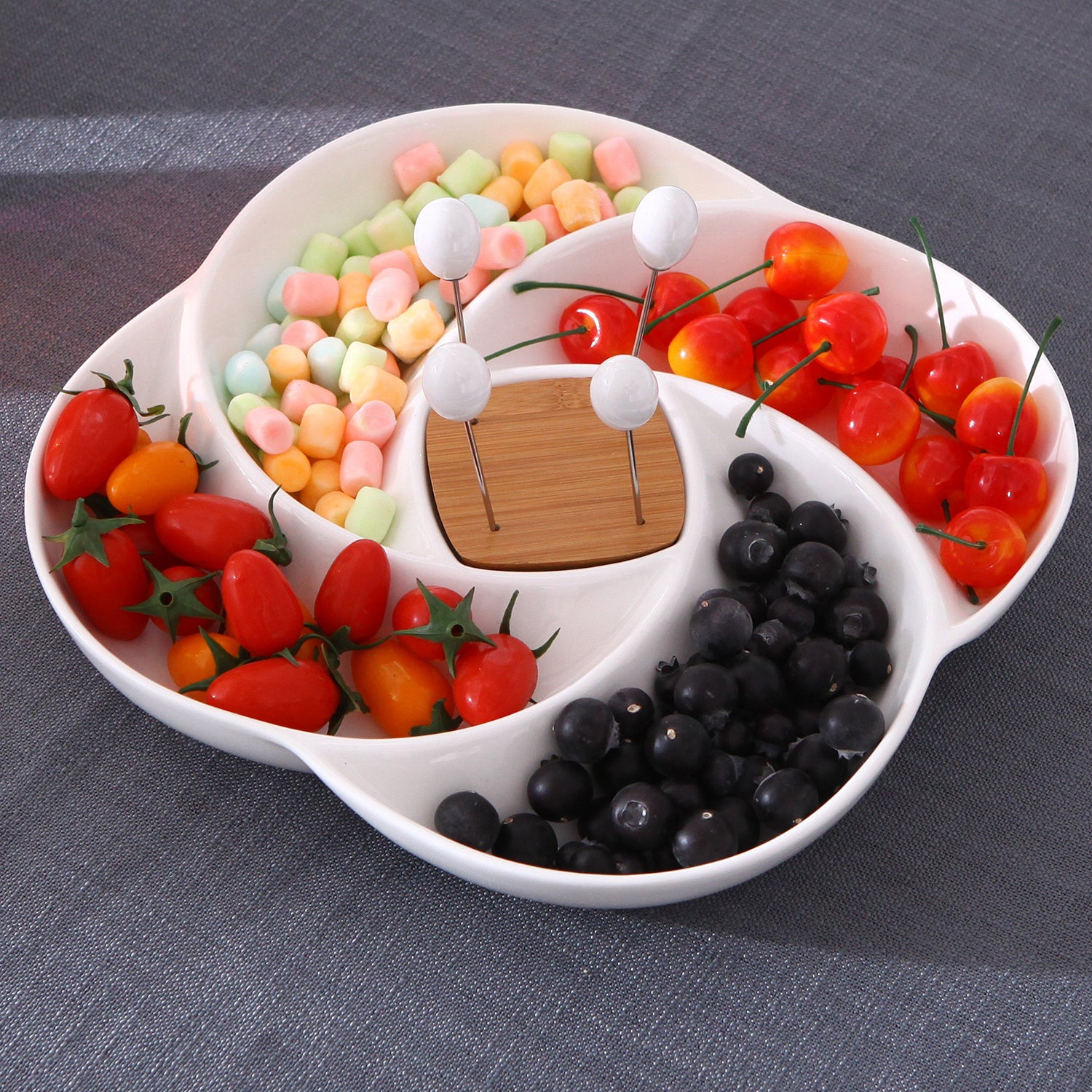 Details: Use this sleek ceramic platter to share appetizers and hors d'oeuvres with guests in a stylish and practical way. With 4 divided sections arranged in a decorative spiraling pattern, this platter offers modern style and space to arrange a variety of different foods. Also included with this platter are 4 metal picks with spherical white handles. Each pick is the ideal utensil for eating appetizers and other small foods in a mess-free and easy manner. When not being utilized, the picks can be stored in a wooden holder that sits in the center of the plate. With a unique, sleek design, this platter is an ideal way to add contemporary style to your next dinner party or get-together.