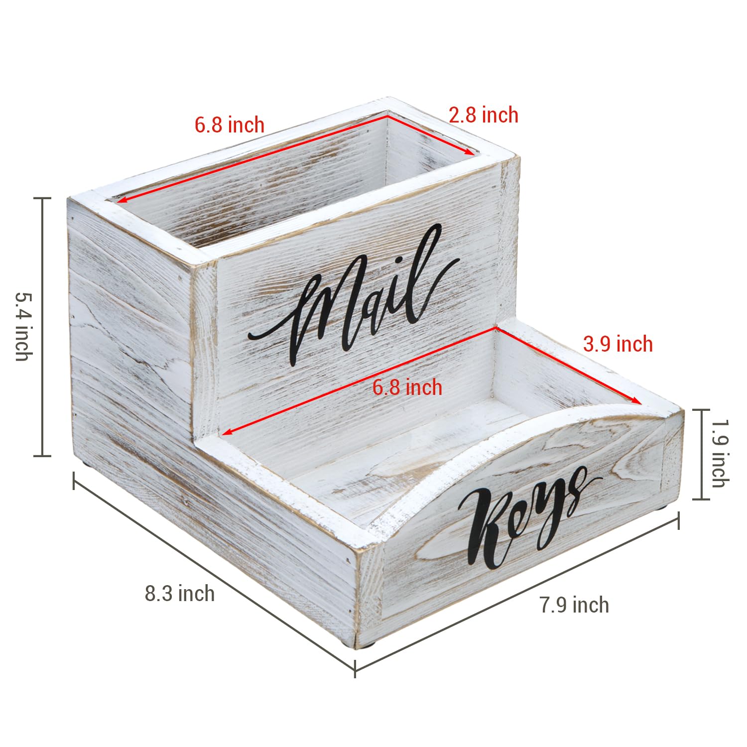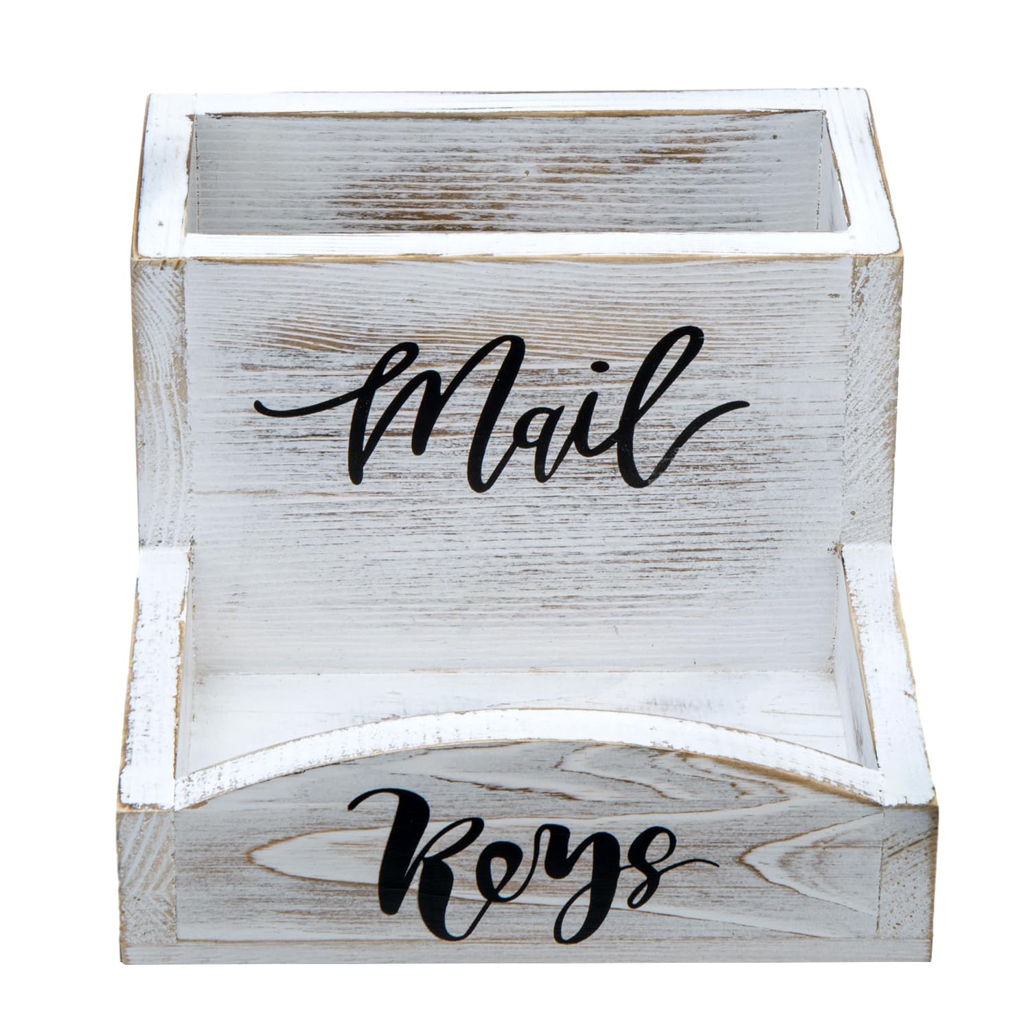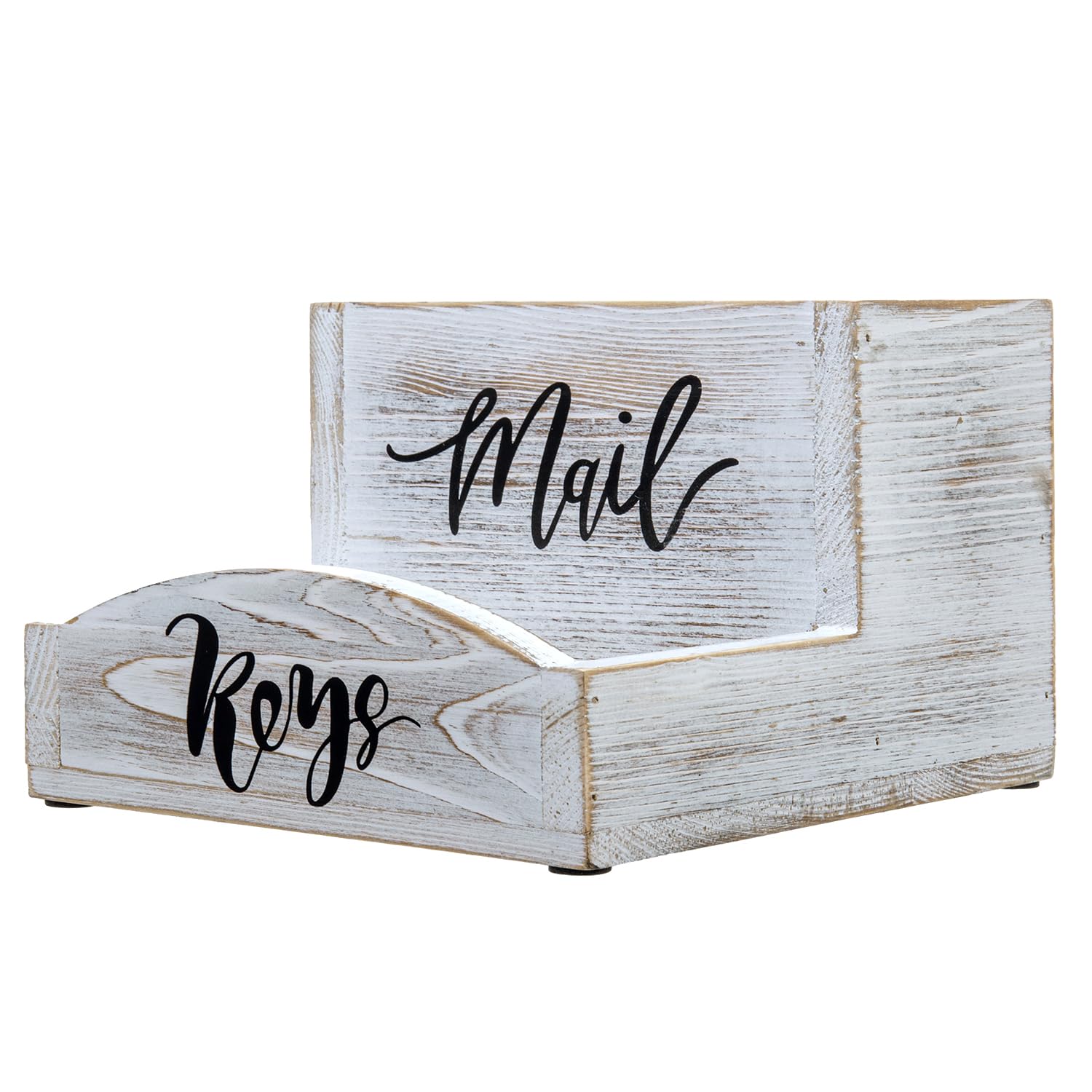 - Farmhouse style wooden tabletop mail organizer and key holder tray with shabby whitewashed finish and stylish cursive "MAIL" and "KEYS" labels