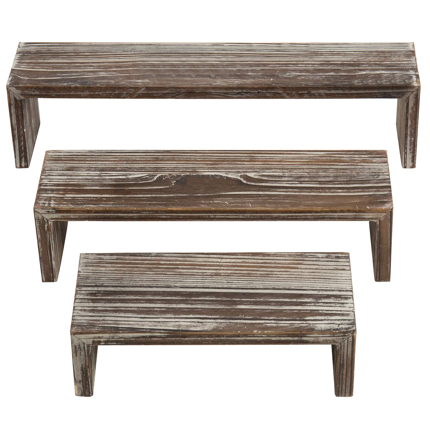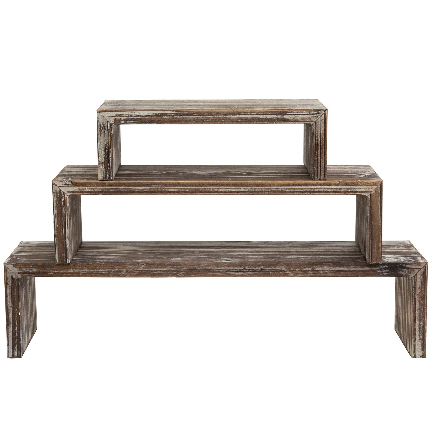 Details: A versatile accessory for both displaying or decorating products, these riser racks invite creativity both at home and in retail settings. Their minimalist design provides sufficient space for displaying jewelry, baked goods, pottery, or other merchandise, and the wooden stands can be displayed in one large tiered arrangement or used individually when necessary. Their torched finish is a great complement to rustic decors and provides nice contrast for decorative items.