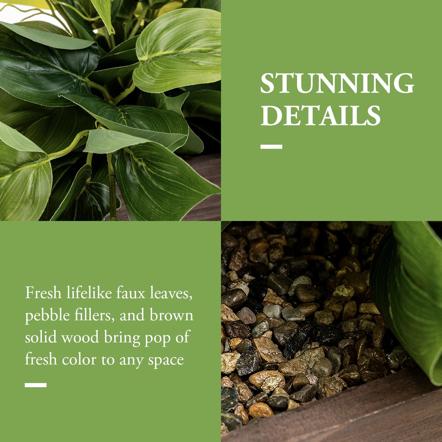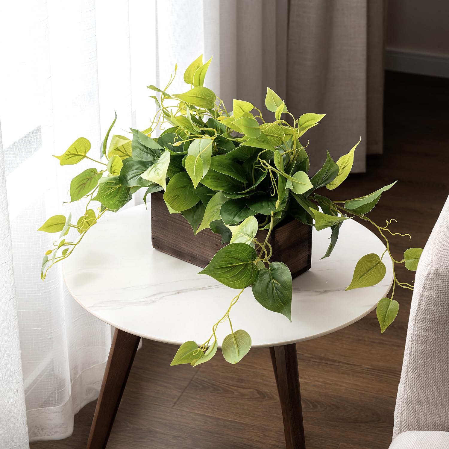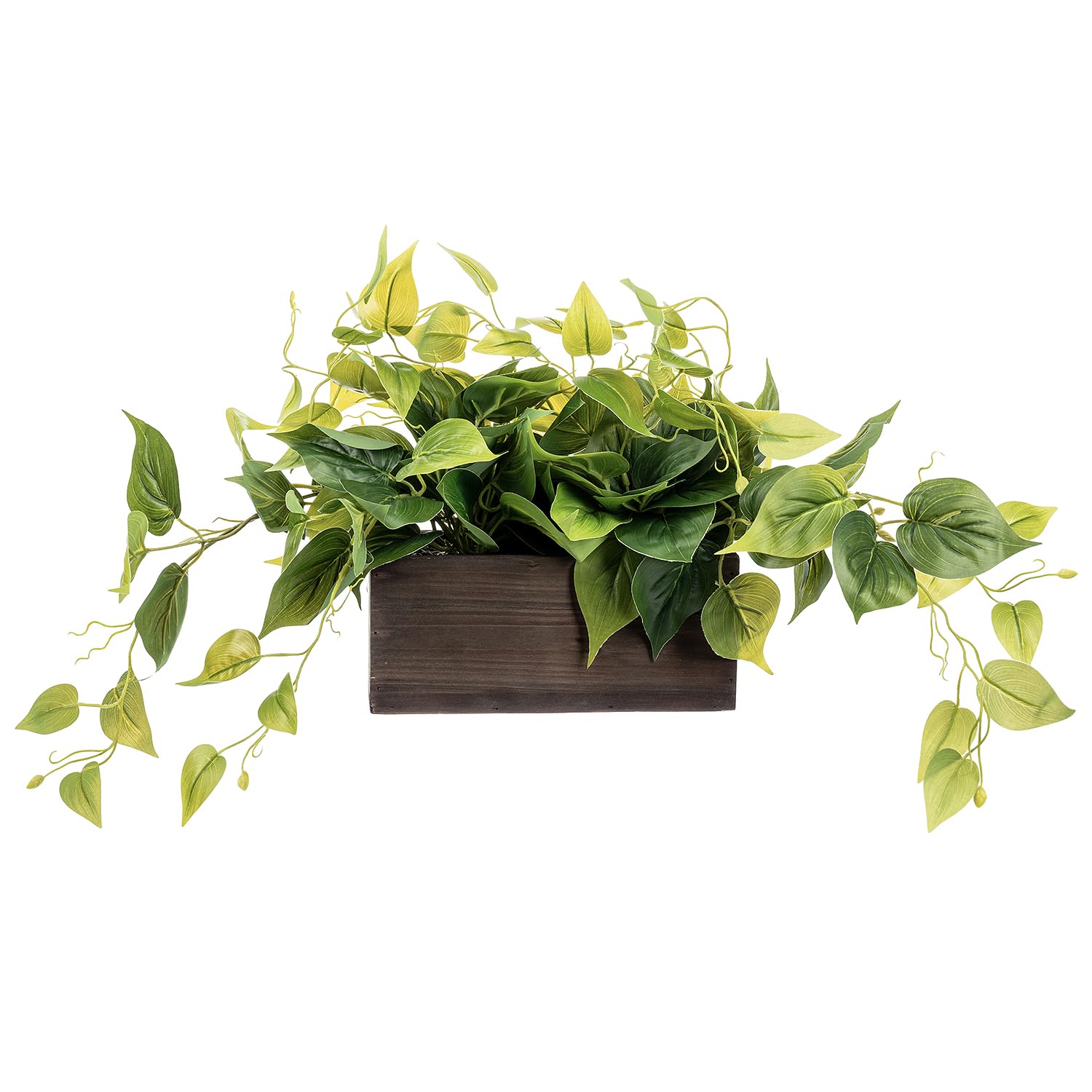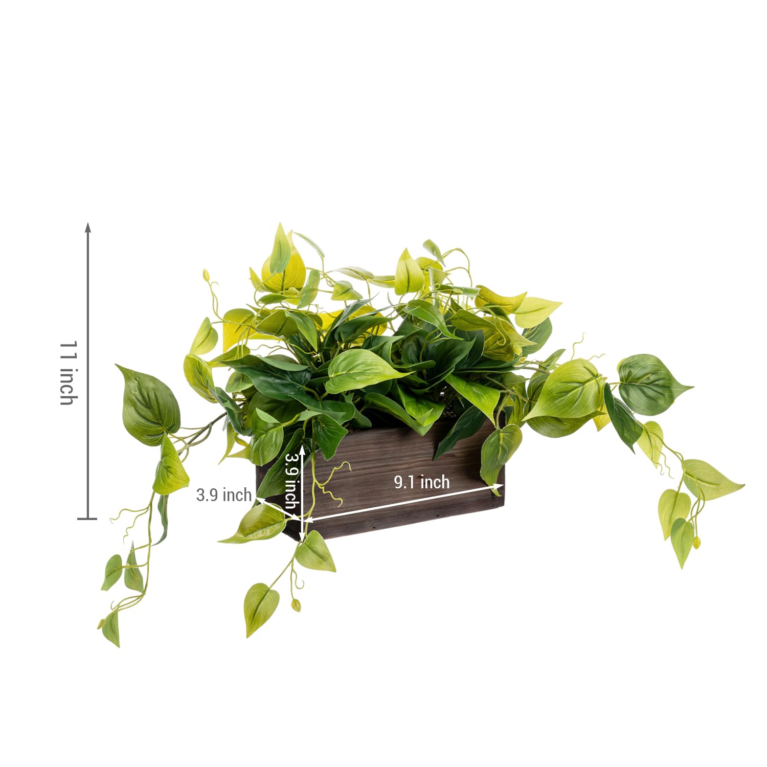 - Decorative artificial pothos tabletop houseplant with lifelike leafy green design and dark brown wooden planter box