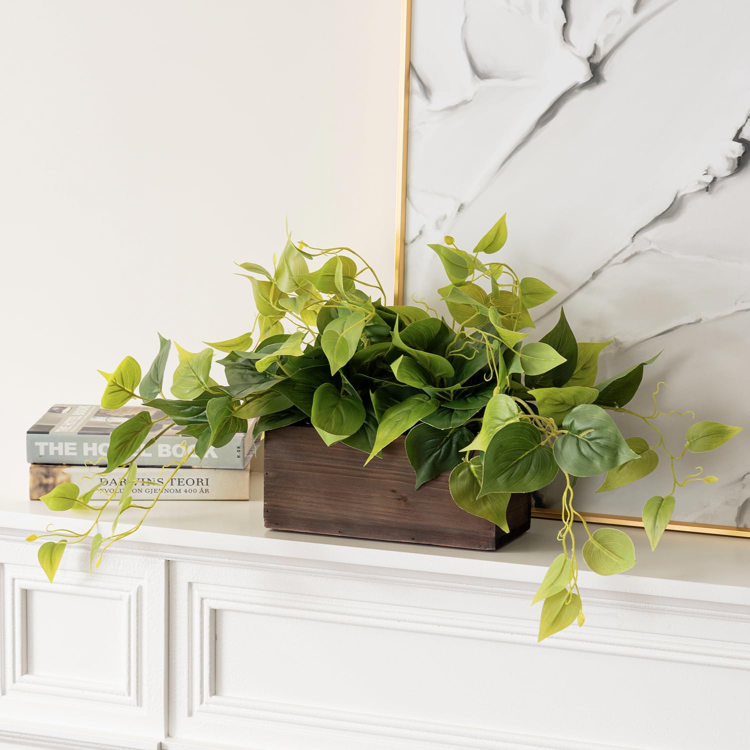 MyGift Vibrant Lifelike Artificial Plant Pothos Leafy Vine Greenery in Burnt Brown Solid Wood Rectangular Planter Box