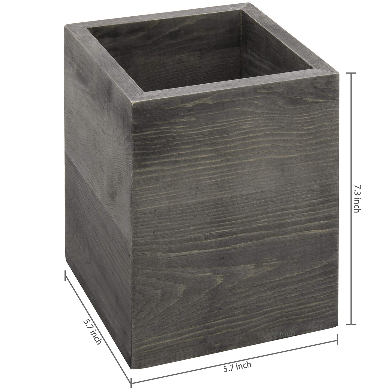 - Farmhouse style countertop utensil holder made of wood with a rustic gray wood finish and square design