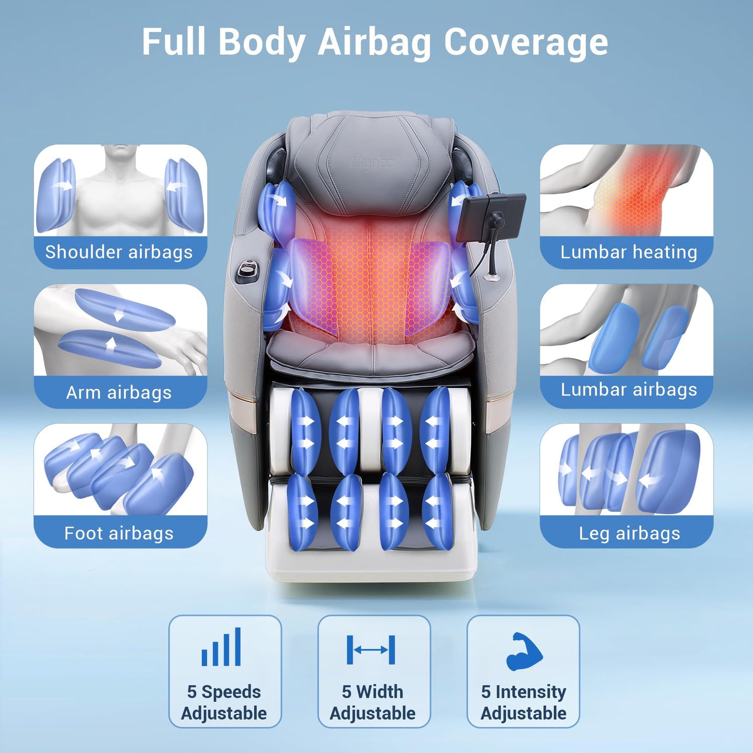 MYNTA Massage Chair Full Body, 170ยฐ Flexible SL Track Shiatsu 3D Massage Chairs with Zero Gravity, Bluetooth Speaker, Airbags & Heating, MC1650(Grey)
