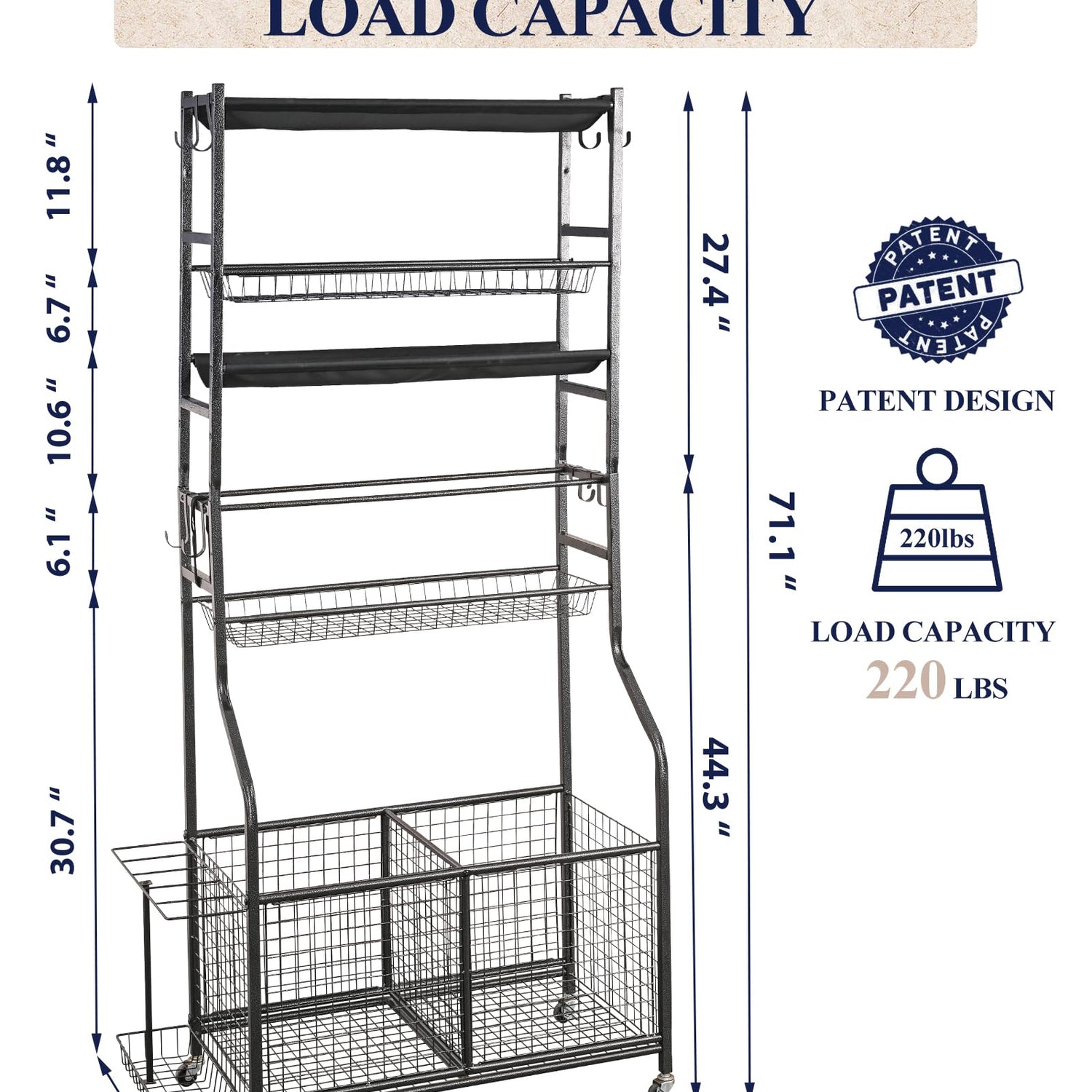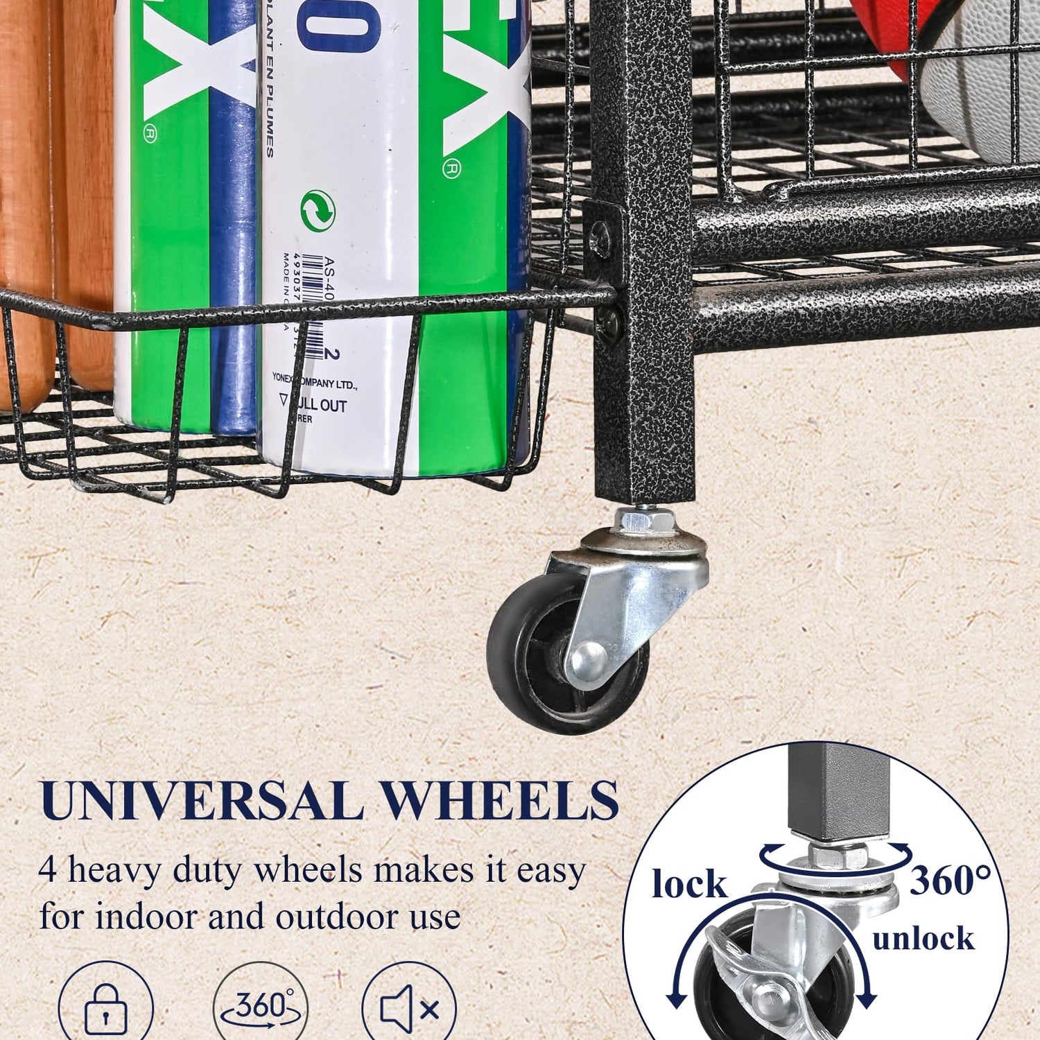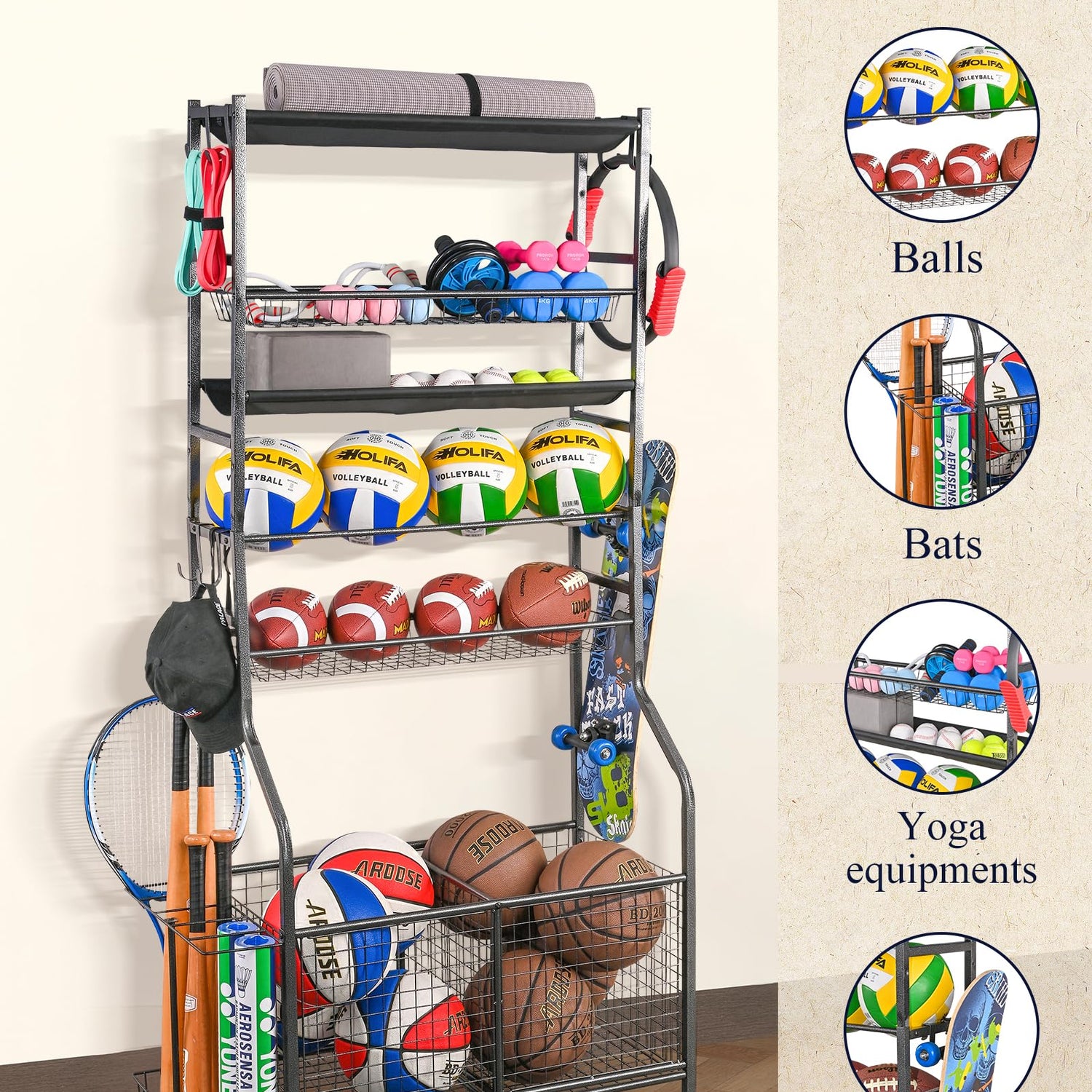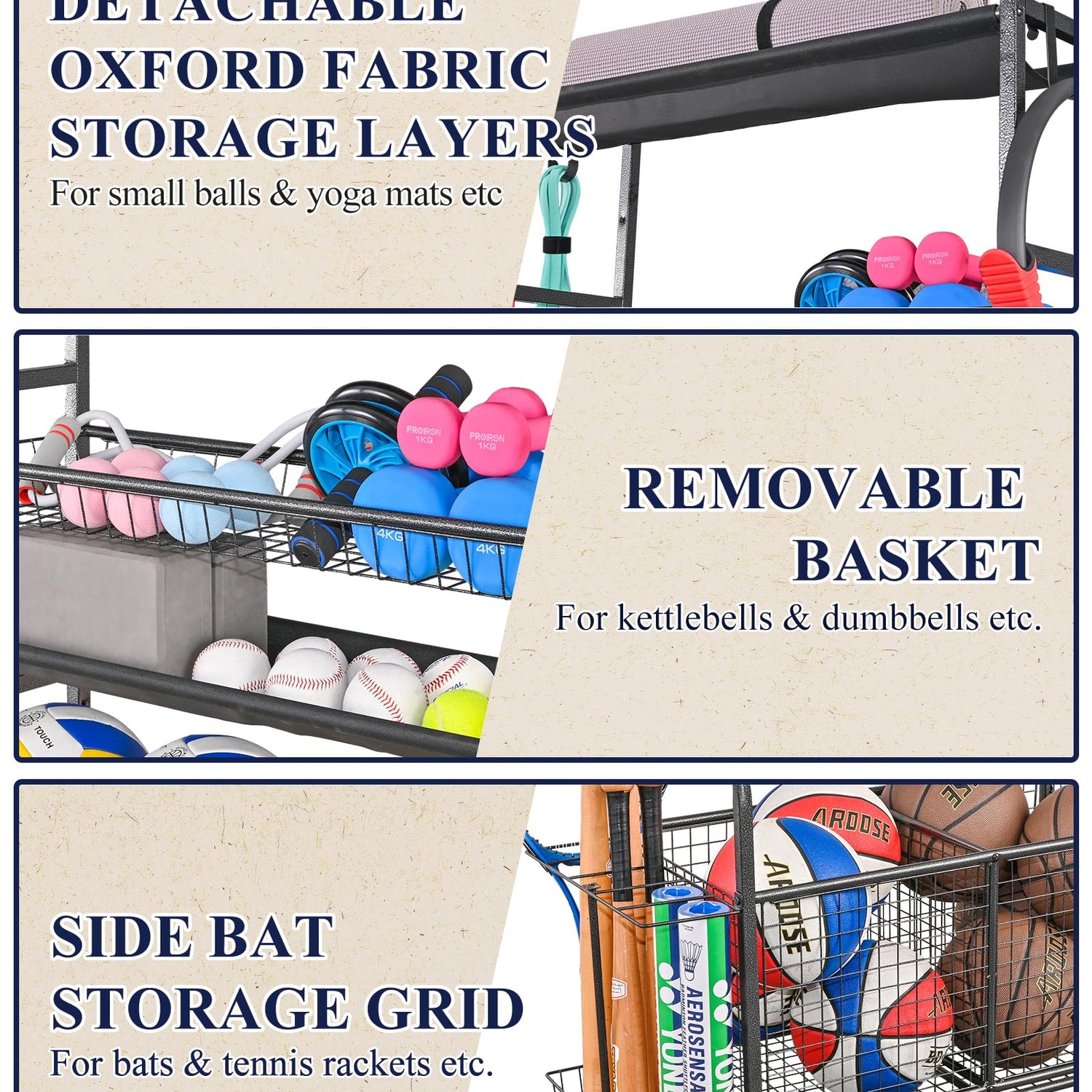 - 【Extra Large Capacity Garage Storage System】Six tiers of storage organize all your sports equipment into this ball cart. basketball rack equipped with 2 large metal storage basket, 2 detachable Layers of Oxford Fabric, 2 Wire Mesh basket, 1 layers iron pipe rack, side bat rack and 8 moveable hooks.