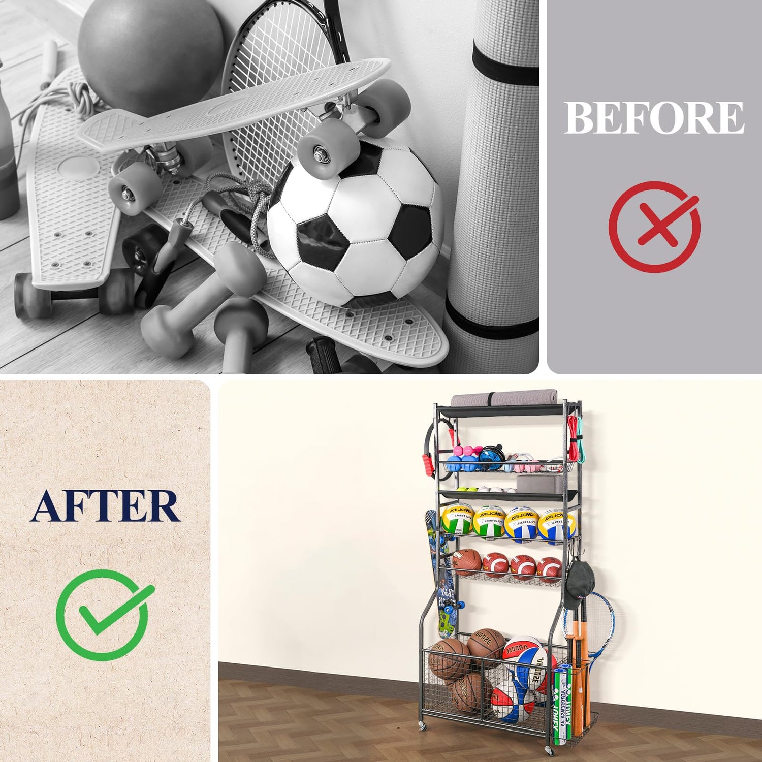- 【Special Connection Design】The entire ball holder is made of two ball rack stacked together to maximize storage space. You can also take it apart and use it separately. Keep all your indoor and outdoor sporting goods easily accessible and organized.