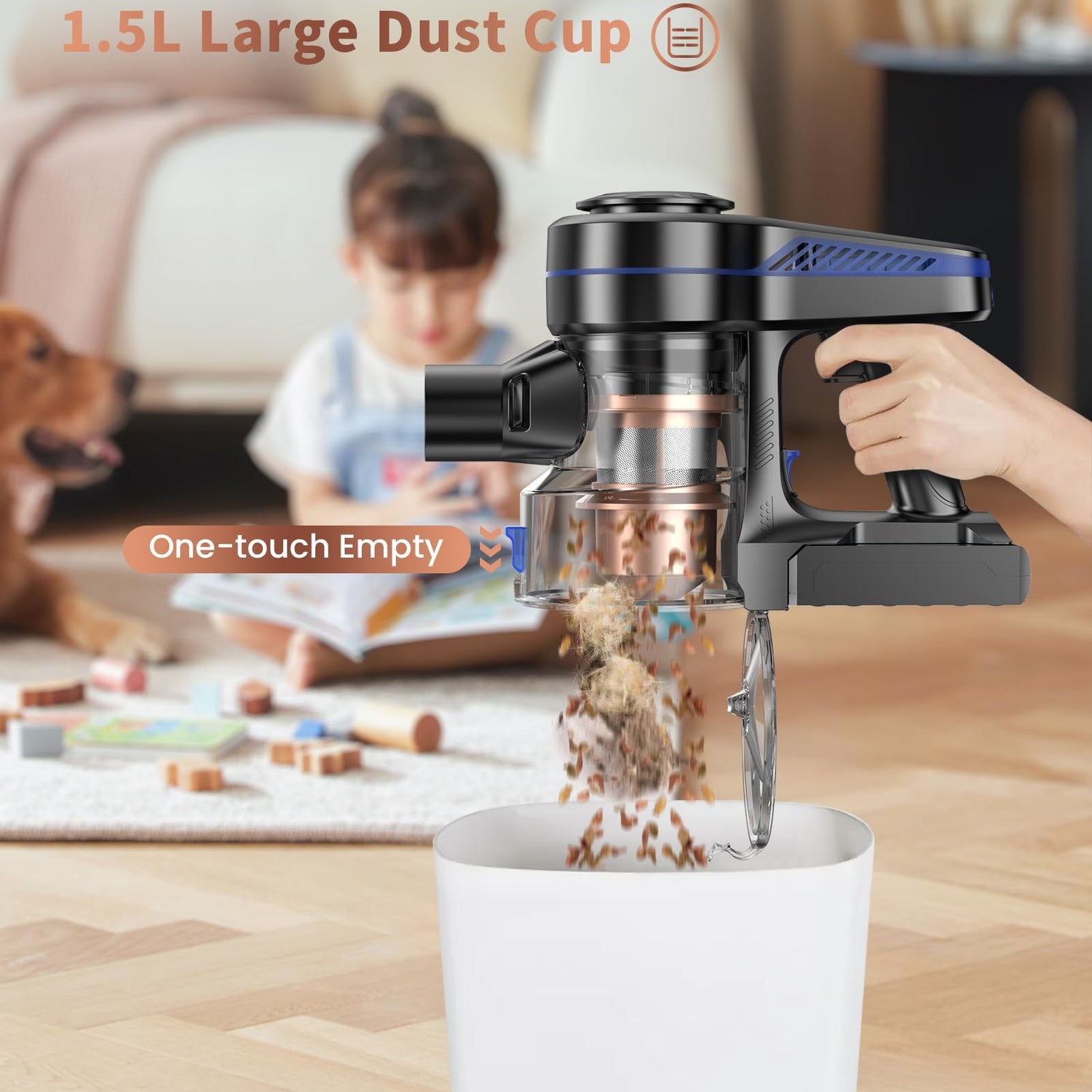 - ๐ฌ๐จ๐บ๐ ๐ป๐ถ ๐ผ๐บ๐ฌ & ๐ณ๐จ๐น๐ฎ๐ฌ ๐ซ๐ผ๐บ๐ป ๐ช๐ผ๐ท โค 1.5L Dust Cup meets multiple cleanings no need to empty the dust cup frequently, one button to empty to avoid with touching the dust. Wireless and lightweight design of the vacuum cleaner can be used anytime and anywhere, use the accessories can be assembled into a multifunctional handheld vacuum cleaner.