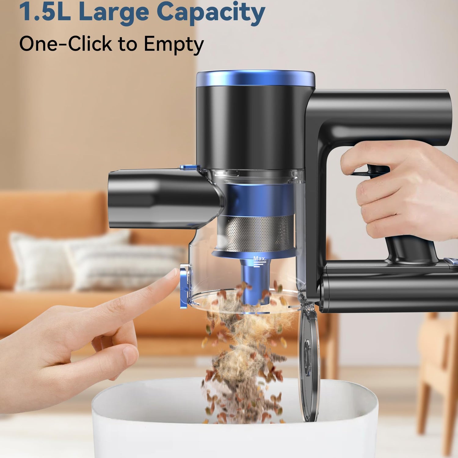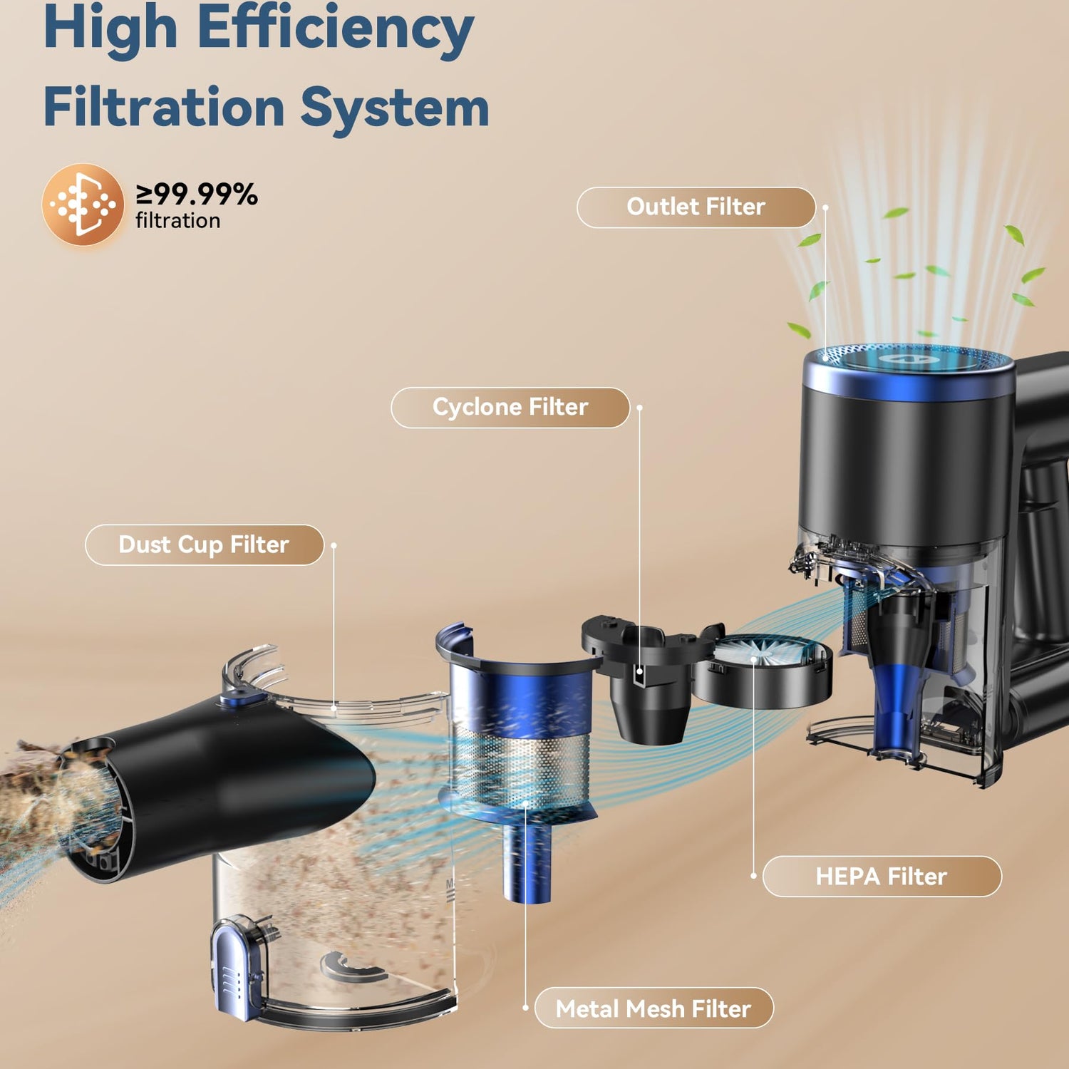- High Efficiency Filter System & 1.5 L Dust Cup: The wireless vacuum cleaner features a new cyclonic filtration technology and a high-density washable HEPA filter that captures up to 99.99% of tiny particles as small as 0.1 micron, providing fresh air for you and your family. The 1.5 L large dust cup can collect more garbage and pet hair at one time, reducing the frequency of emptying