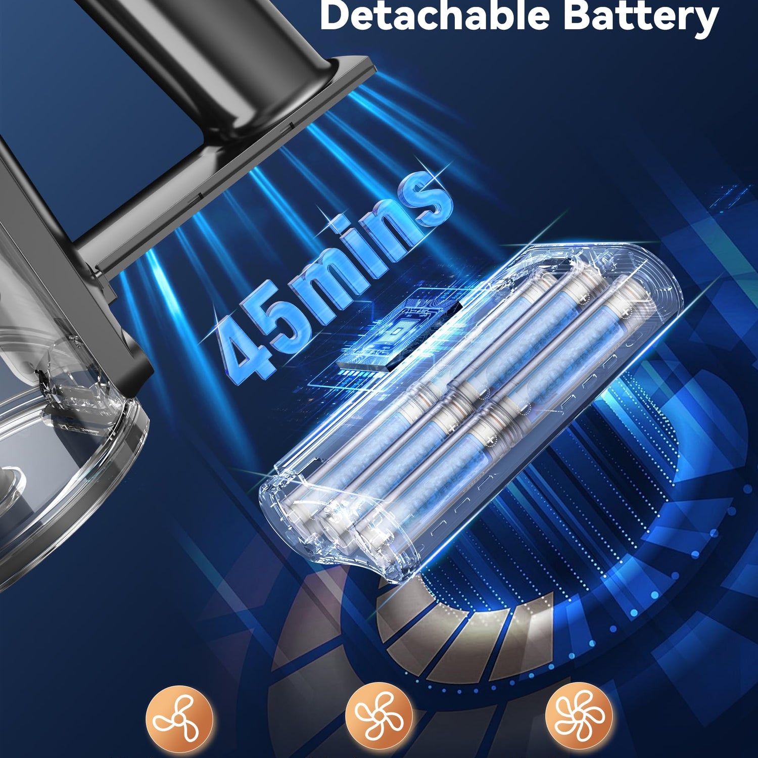 - Long-Lasting Battery Long Running Time: The ME02 stick vacuum cleaner is powered by a 2200 mAh high-capacity and ultra-fast rechargeable battery that delivers an impressively long runtime, lasting up to 45 minutes in standard mode, allowing you to deep clean your entire house without interruption. The battery has no memory effect and runs 20% longer than other vacuum cleaners
