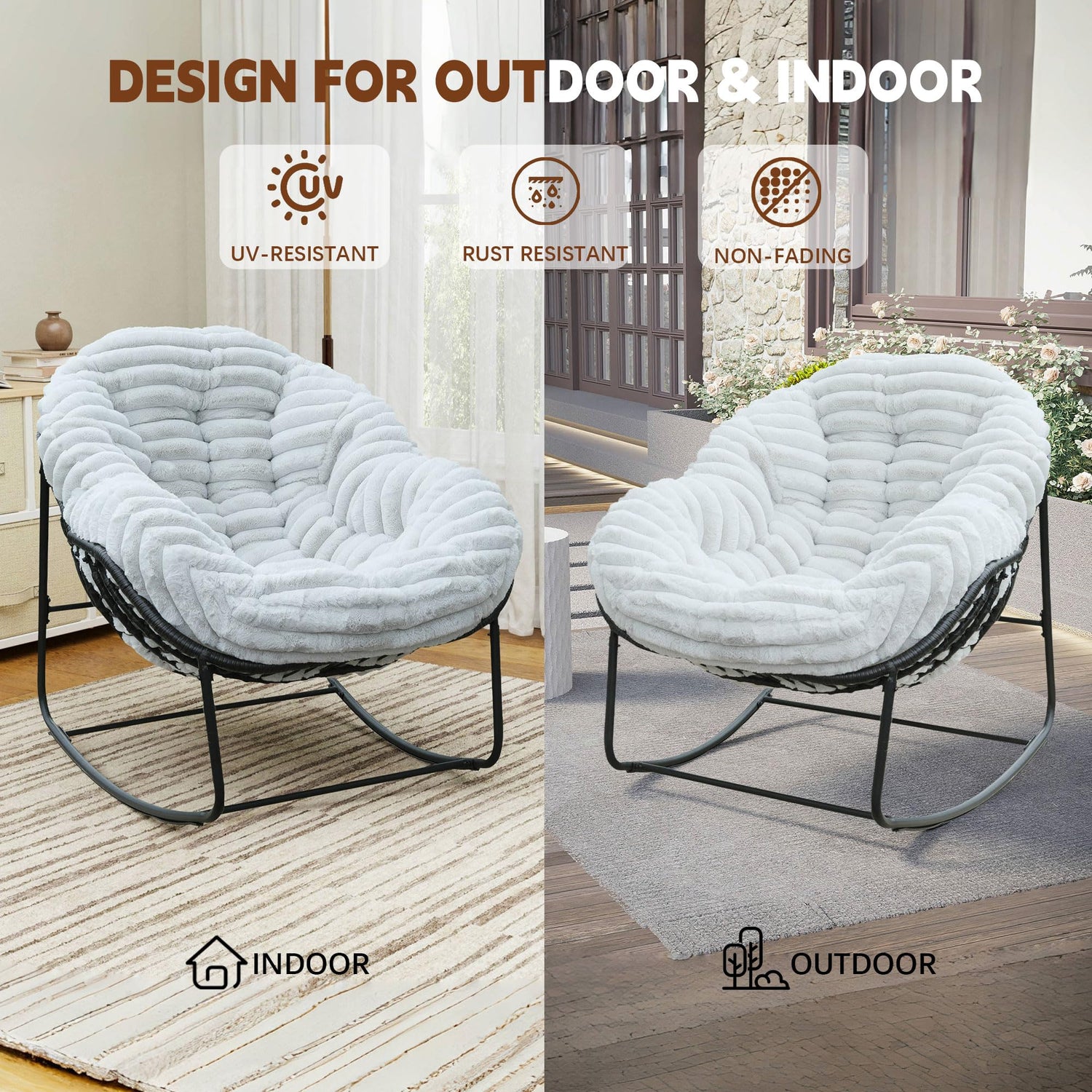 Naga Bahna Outdoor Rocking Chair, Patio Wicker Egg Chair, Indoor Comfy Oversized Papasan Chair with Padded Cushion, Royal Rattan Rocker for Front Porch, Garden, Patio (Light Grey)