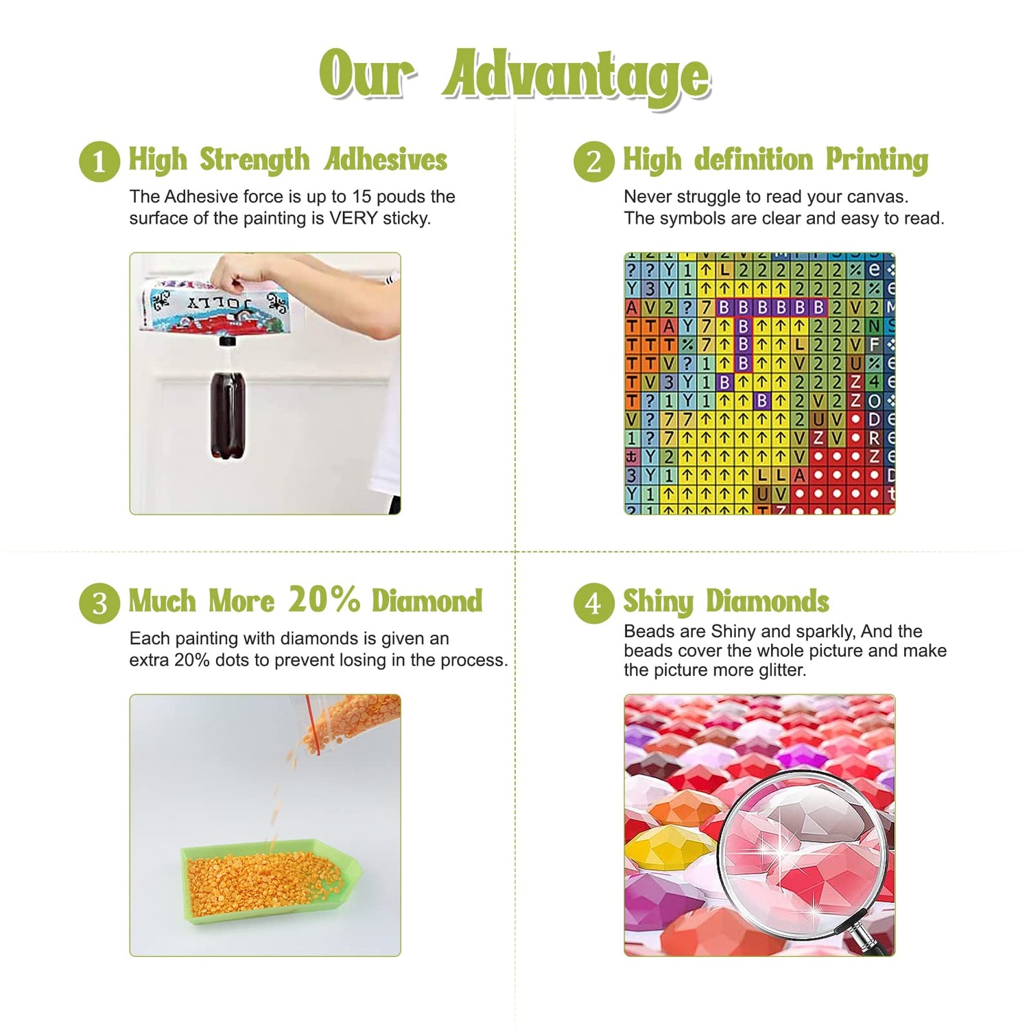 - Diamond Painting Kits: Round diamonds full drill of the whole picture, it can present the best artistic effect. If you have enough time and patience to complete this challenge, you will get a sense of accomplishment