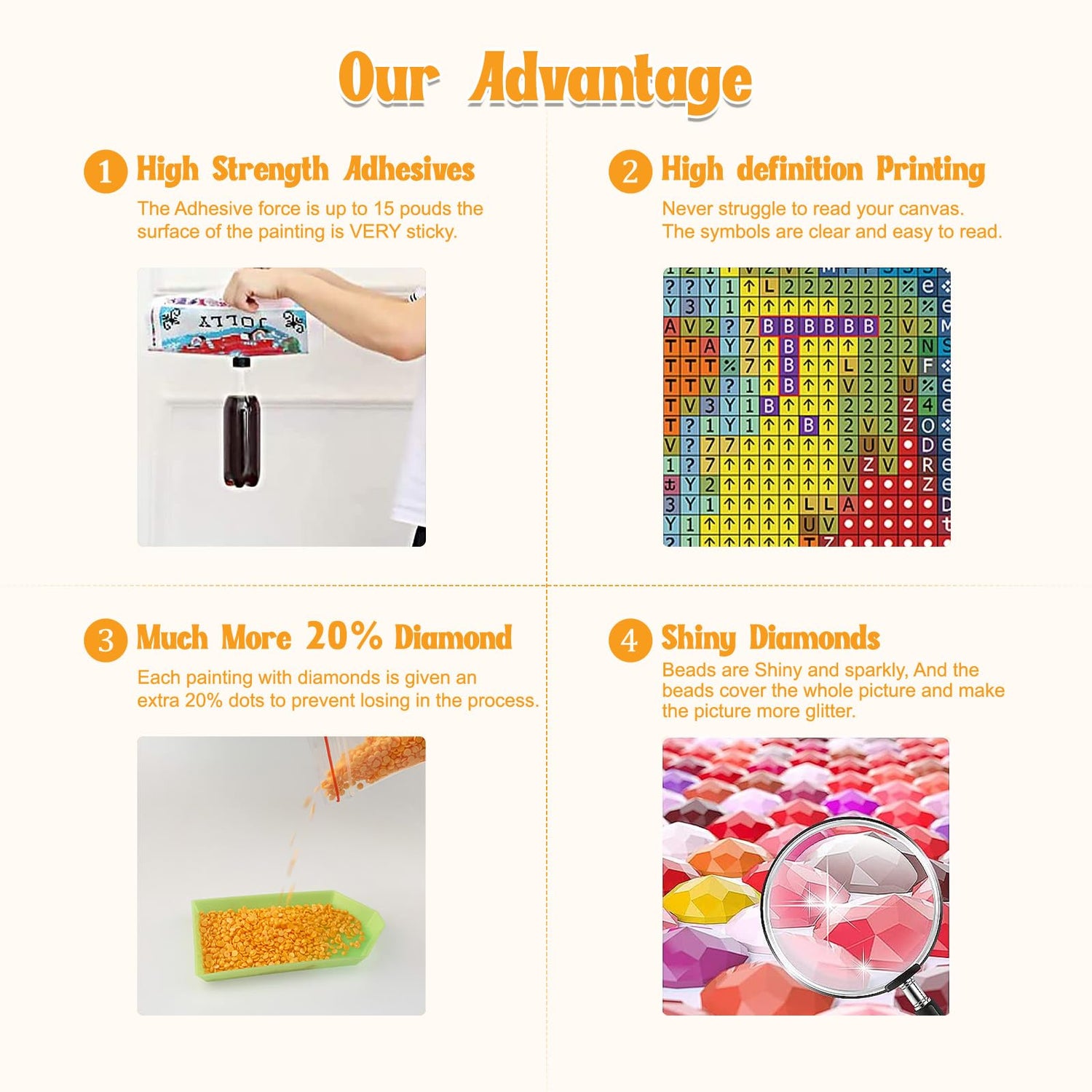 - What You Will Get: Diamond art kits includes a high definition painting canvas, a red glue clay, a cube diamond tray, enough colorful round diamonds. We also offer an extra 30% drilling for each color