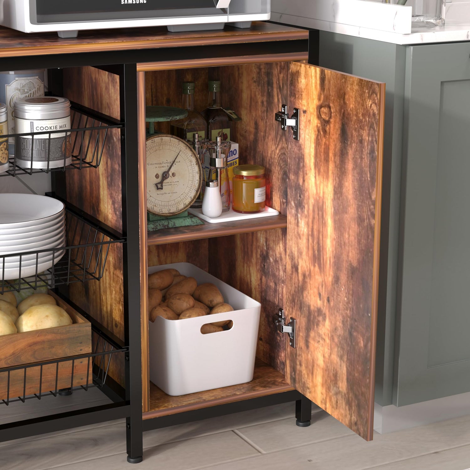 - 【Industrial Style】 This bakers rack equipped with three pull-out baskets, which can more conveniently store fruits, vegetables, pots, etc., and there is also a cabinet with a door, making the entire shelf appear more stable and atmospheric