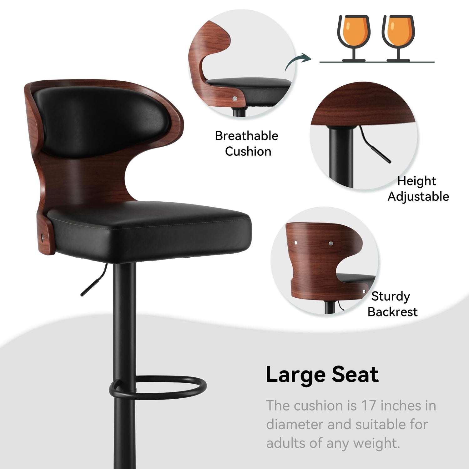 Nalupatio Bar Stools Set of 2 Seat Adjustable Height 24.5-33.5IN - Bentwood Swivel Barstools with Back & Footrest - PU Leather Upholstered Bar Chair for Bar, Kitchen, Dining Room