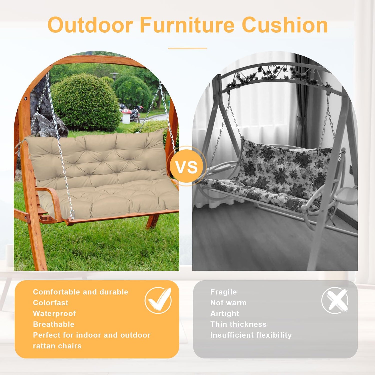 - 【All Weather Use】Outdoor swing cushions are waterproof and made of durable outdoor polyester fabric, ensuring they can withstand the elements such as water, sun, and stains. To maximize longevity, it is recommended to allow the cushions 24 hours for proper rebound after being vacuum compressed.