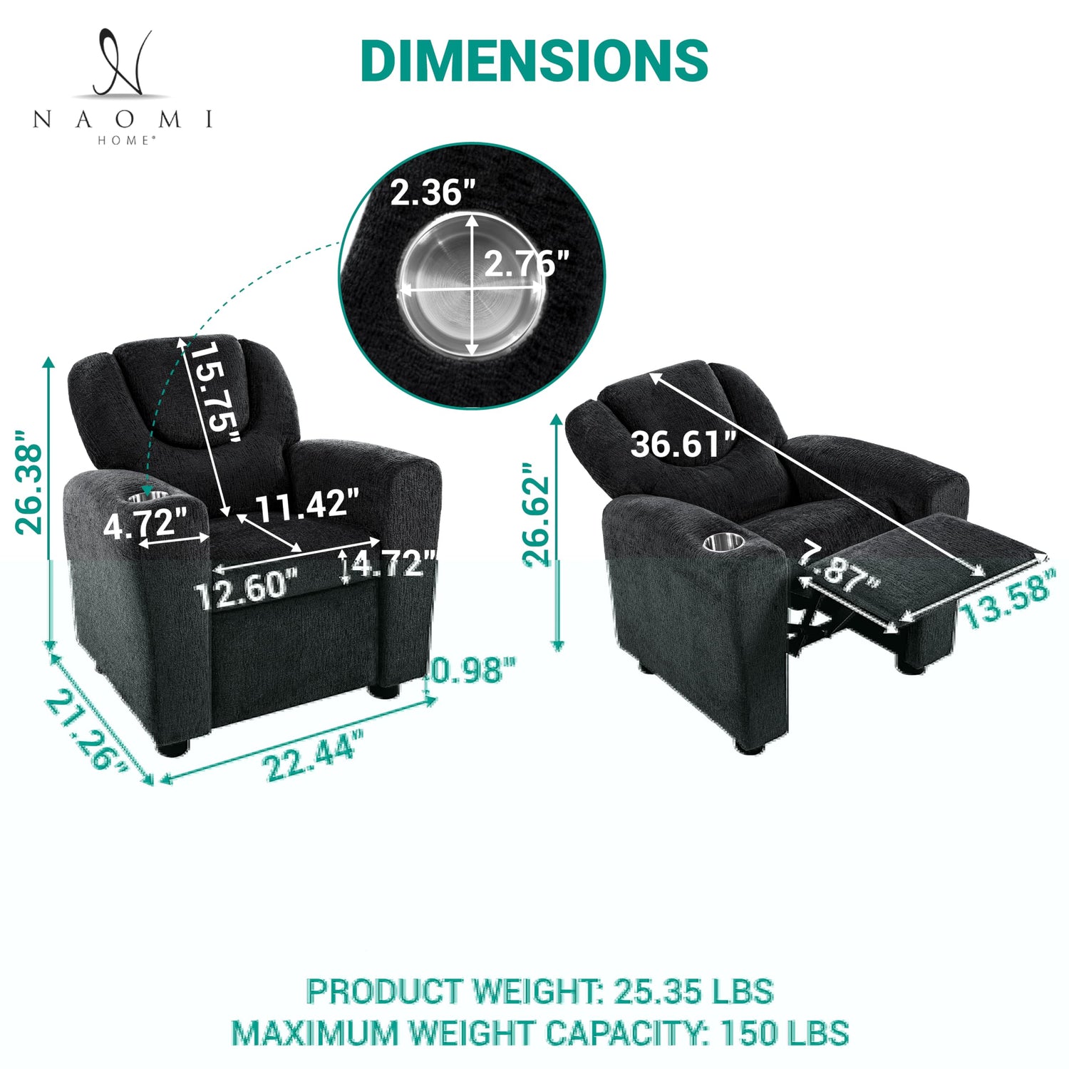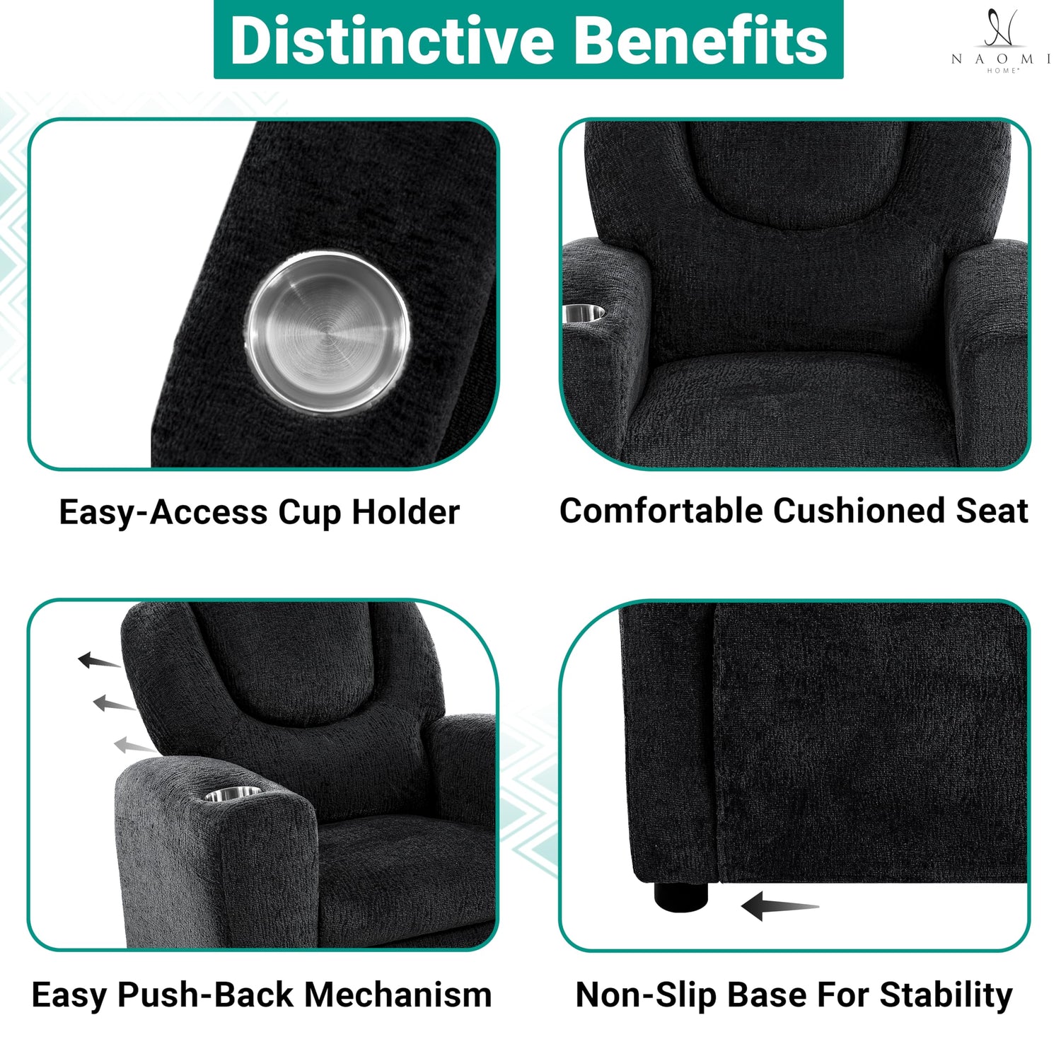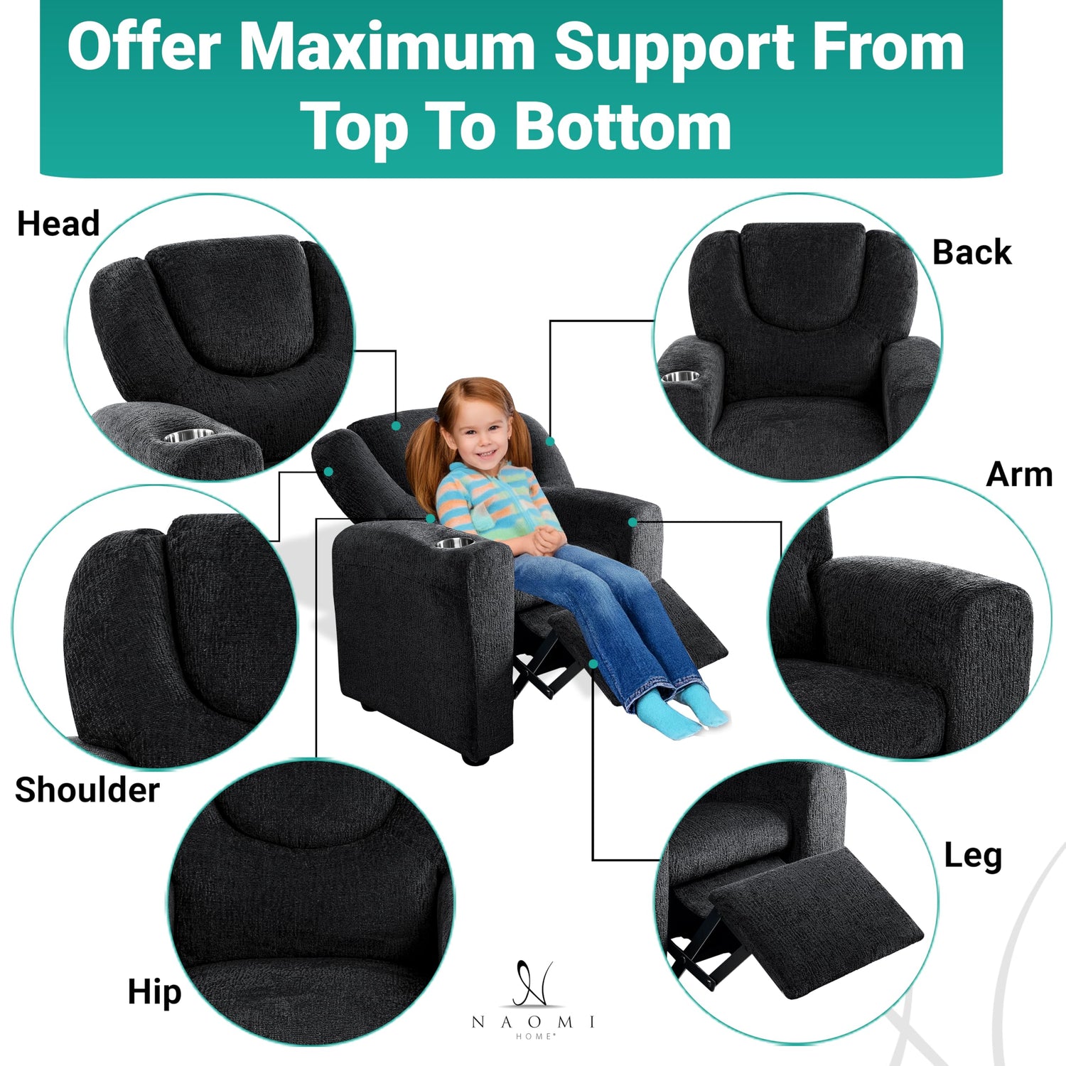 Naomi Home Suri Kids Recliner Chair with Cup Holder & Footrest, Black Chenille - Cozy Lounge for Toddlers & Children