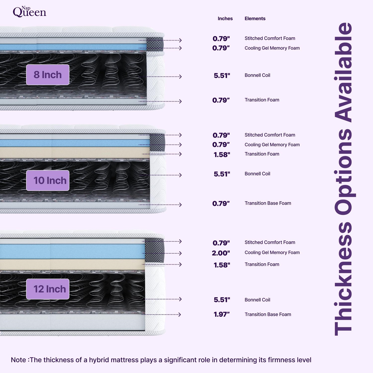 - The NapQueen hybrid mattress is available in 5 different sizes – Twin, Twin XL, Full, Queen, King, perfect to upgrade your matrimonial bedroom, kids’ bedroom, student dorm, apartment, RV, or guest room!
