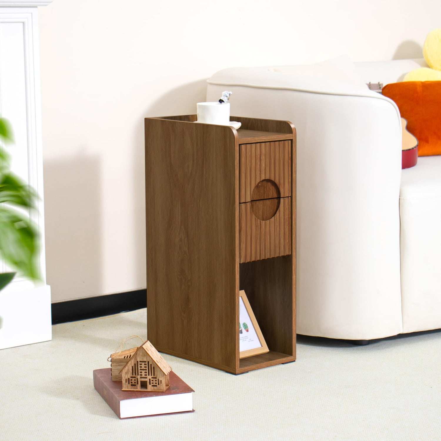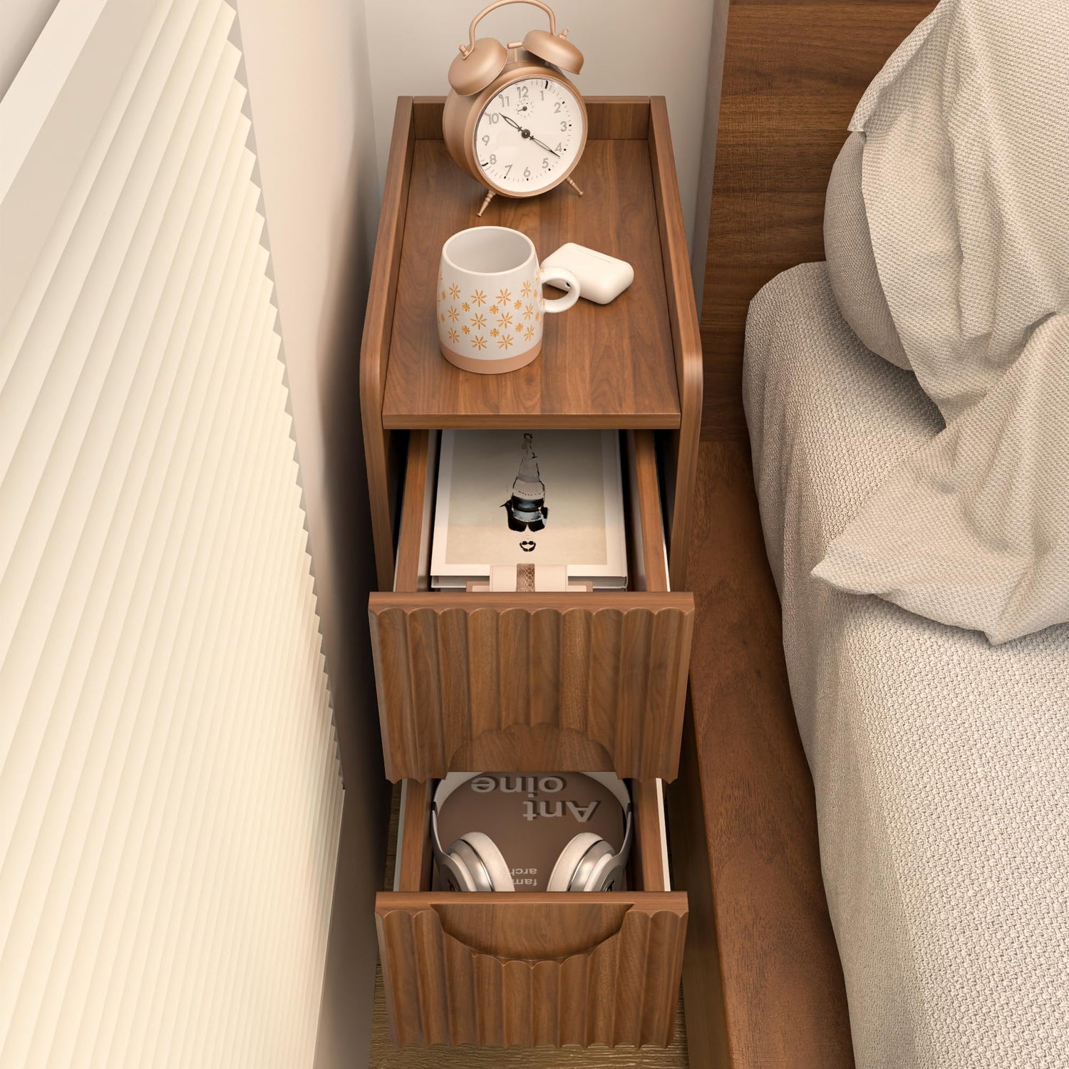 Narrow Fluted Nightstand Set of 2, Wooden Small 2 Drawer Nightstand, Slim Side End Table, Vintage Bedside Table, Mid Century Modern Night Stand with Drawers, for Living Room, Bedroom, Walnut