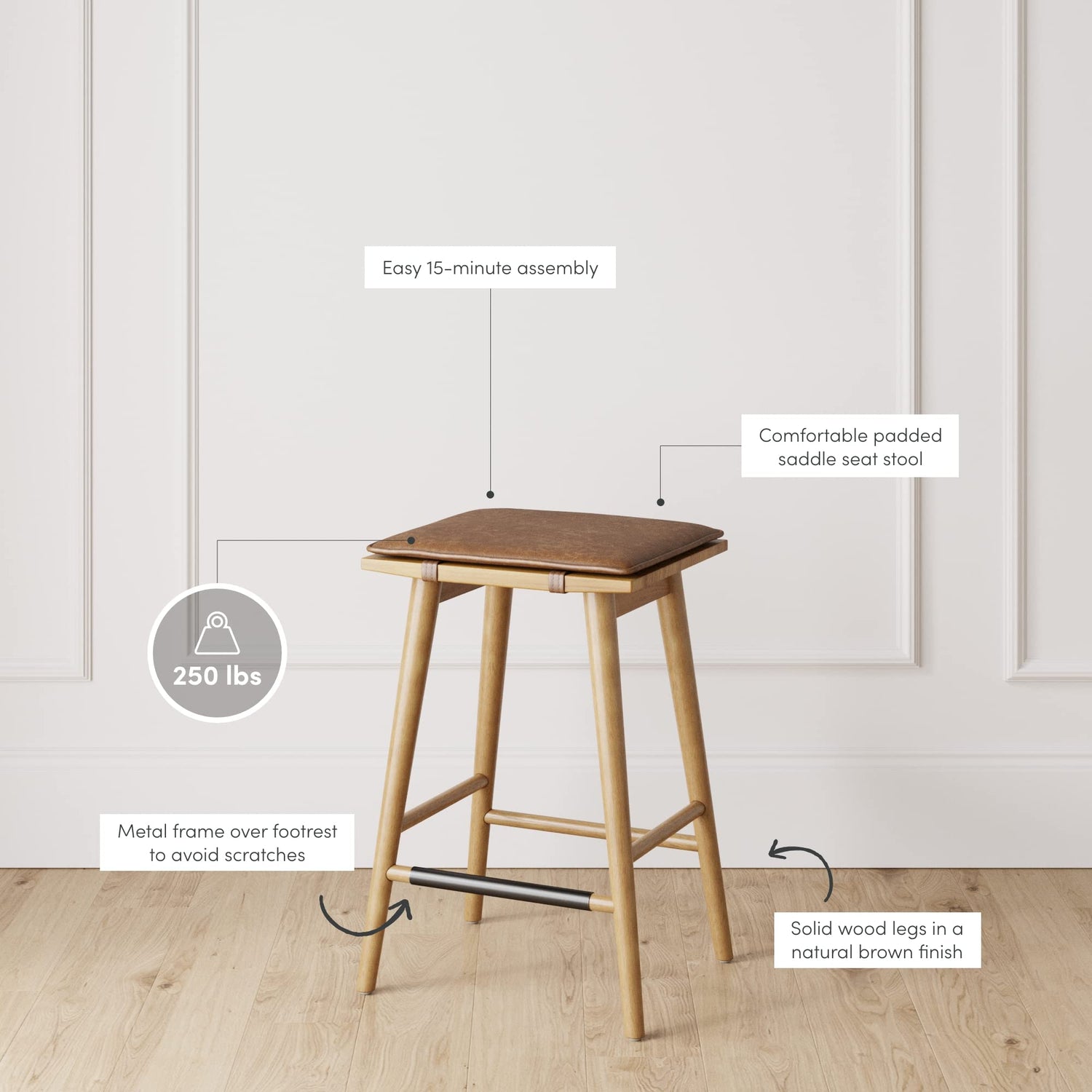 Details: Keep your kitchen guest-ready with our mixed-material Barker bar stool. Sit comfortable for hours on its removable padded saddle seat that's made of easy to wipe clean leather and held up by solid wood legs and perfectly-placed foot rests. This kitchen island stool features a metal frame over the footrest to avoid any scratches. Backer 27"" tall counter stool is perfect for tucking under your kitchen counter when not in use. We have no doubt that this bar stool is going to be a dinner party favorite. Nathan James is the furniture company built for this generation. You don't need to spend a fortune to get quality design-first furniture, and when we say easy assembly, we mean it. Our guarantee is our word. Your purchase is backed by a 100% money-back guarantee. If you have any quality issues, contact us, and we will send you a replacement immediately—no questions asked. This product is not recommended for commercial use. Materials: -Light Brown Chestnut Wood - Vintage Brown PU Leather Cushion Assembly Must-Haves: -Scissors Weight Limit: - 250 lbs
