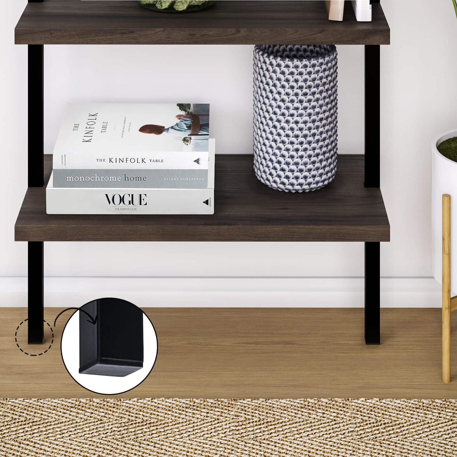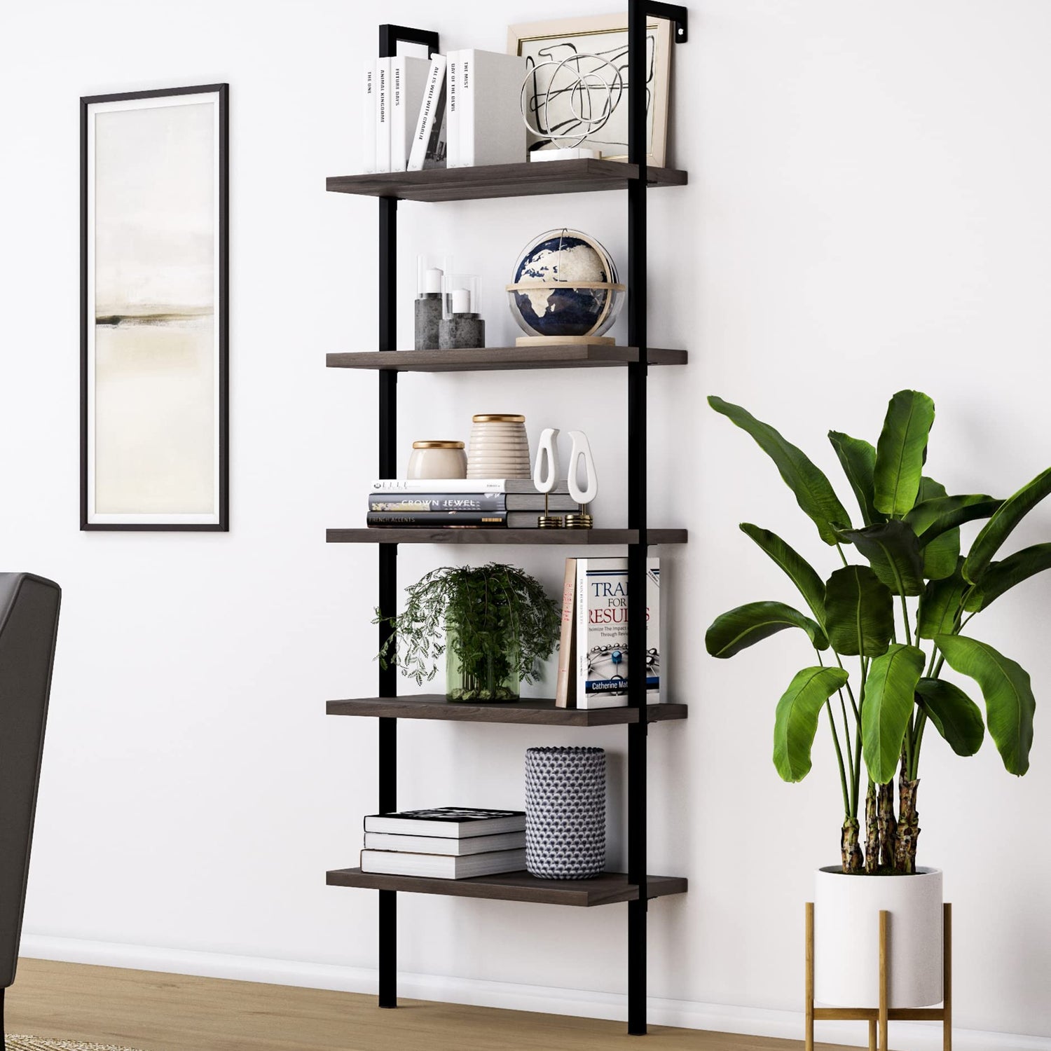 Nathan James Theo 5-Shelf Wood Modern Bookcase, Open Wall Mount Ladder Bookshelf with Industrial Metal Frame, Dark Brown Nutmeg/Black