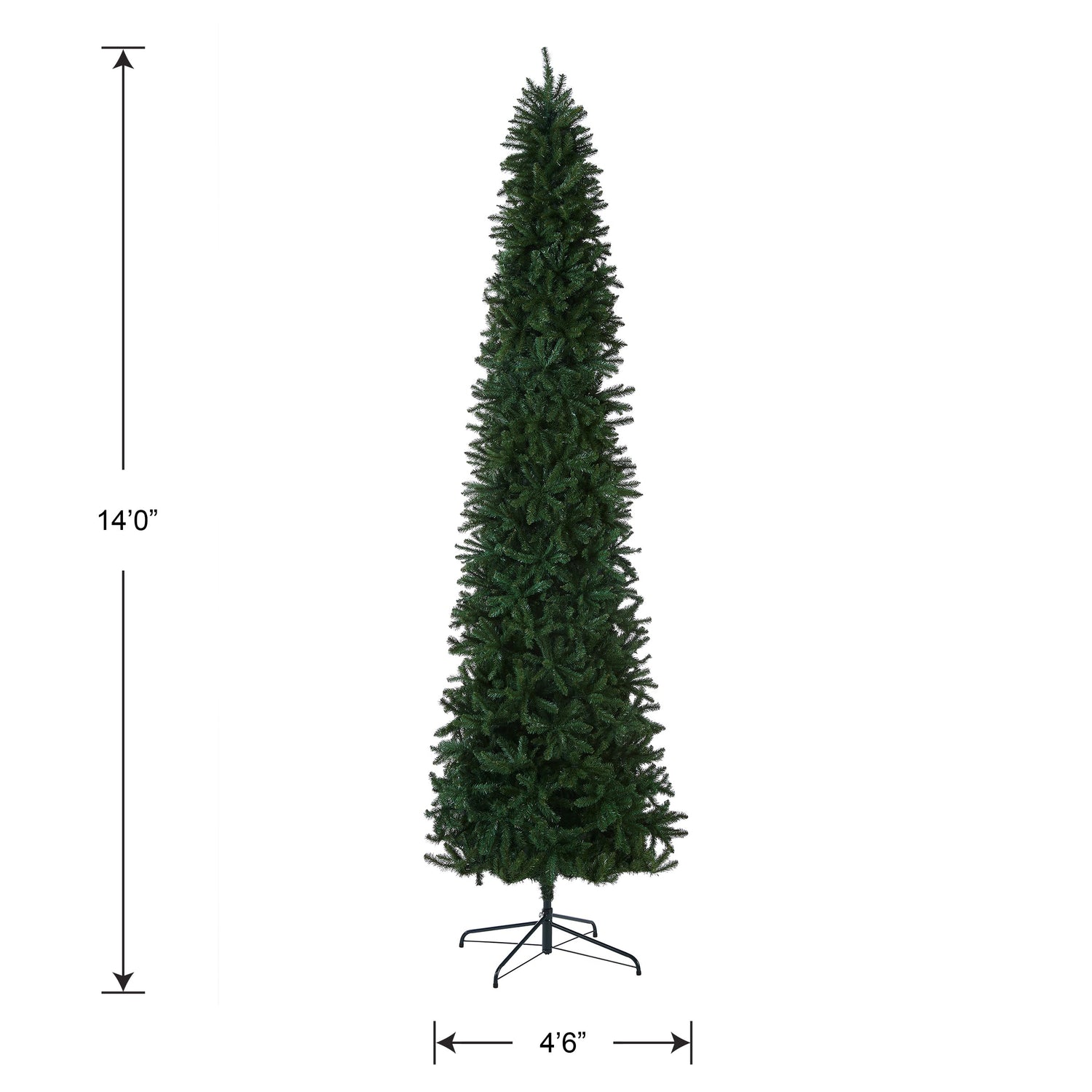 - This Kingswood Fir Slim Artificial Green Christmas Tree is 14 feet tall with a 54 inch base diameter. Featuring hundreds of individually crafted branch tips to create full bodied branches, this tree is designed to look and feel lifelike.