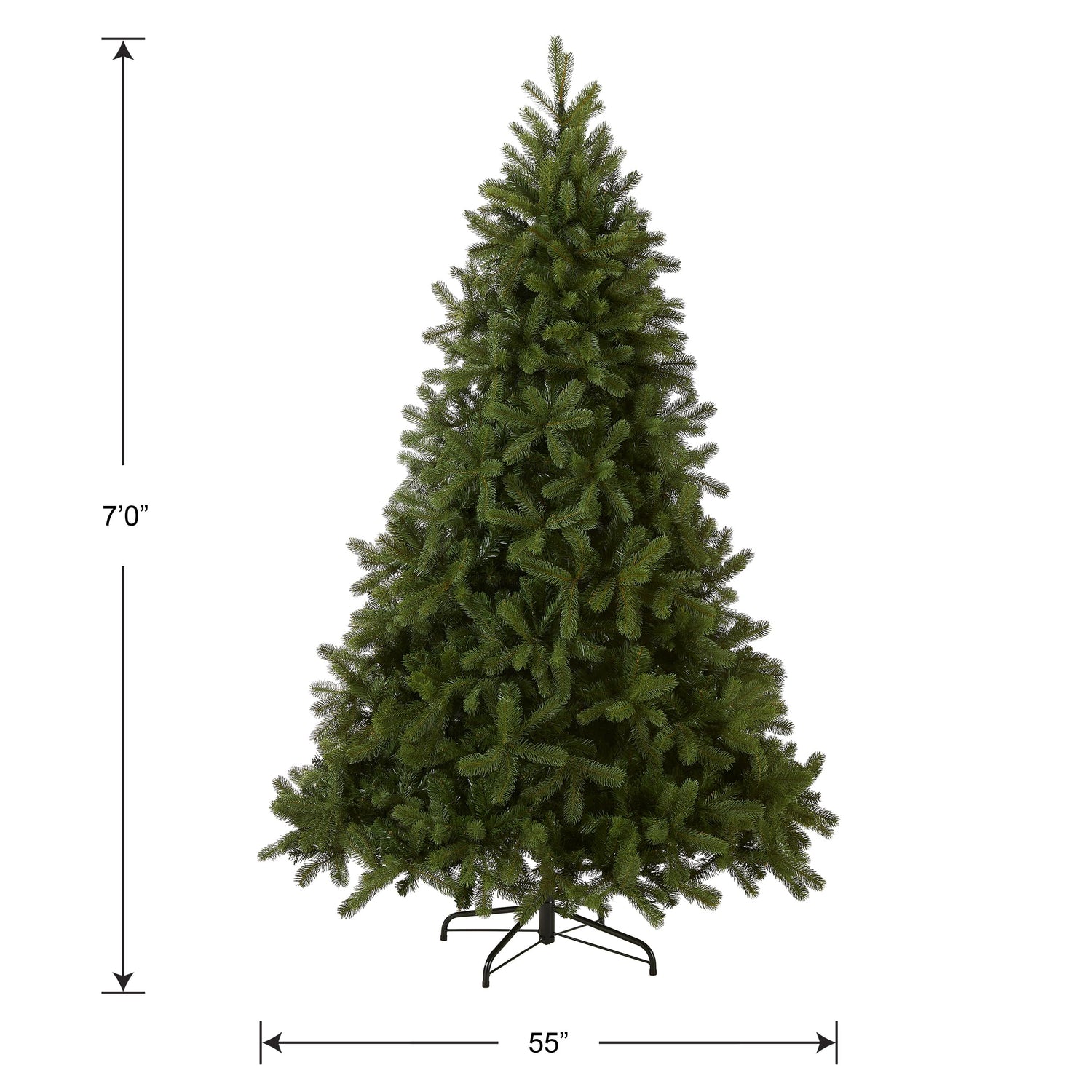• This Downswept Douglas Fir Full Artificial Green Christmas Tree is 7 feet tall with a 55 inch base diameter. Featuring hundreds of 'Feel Real' individually crafted branch tips to create full bodied branches, this tree is designed to look and feel lifelike.