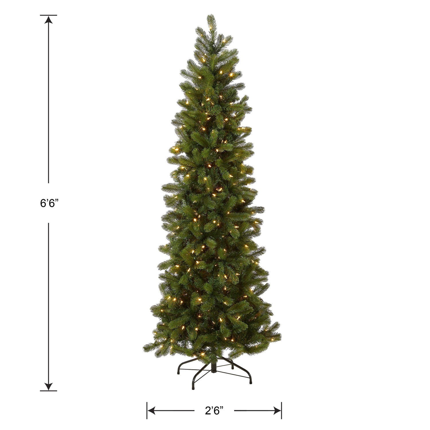 - This Downswept Douglas Fir Slim Pre-Lit Artificial Green Christmas Tree is 6.5 feet tall with a 30 inch base diameter. Featuring hundreds of 'Feel Real' individually crafted branch tips to create full bodied branches, this tree is designed to look and feel lifelike.