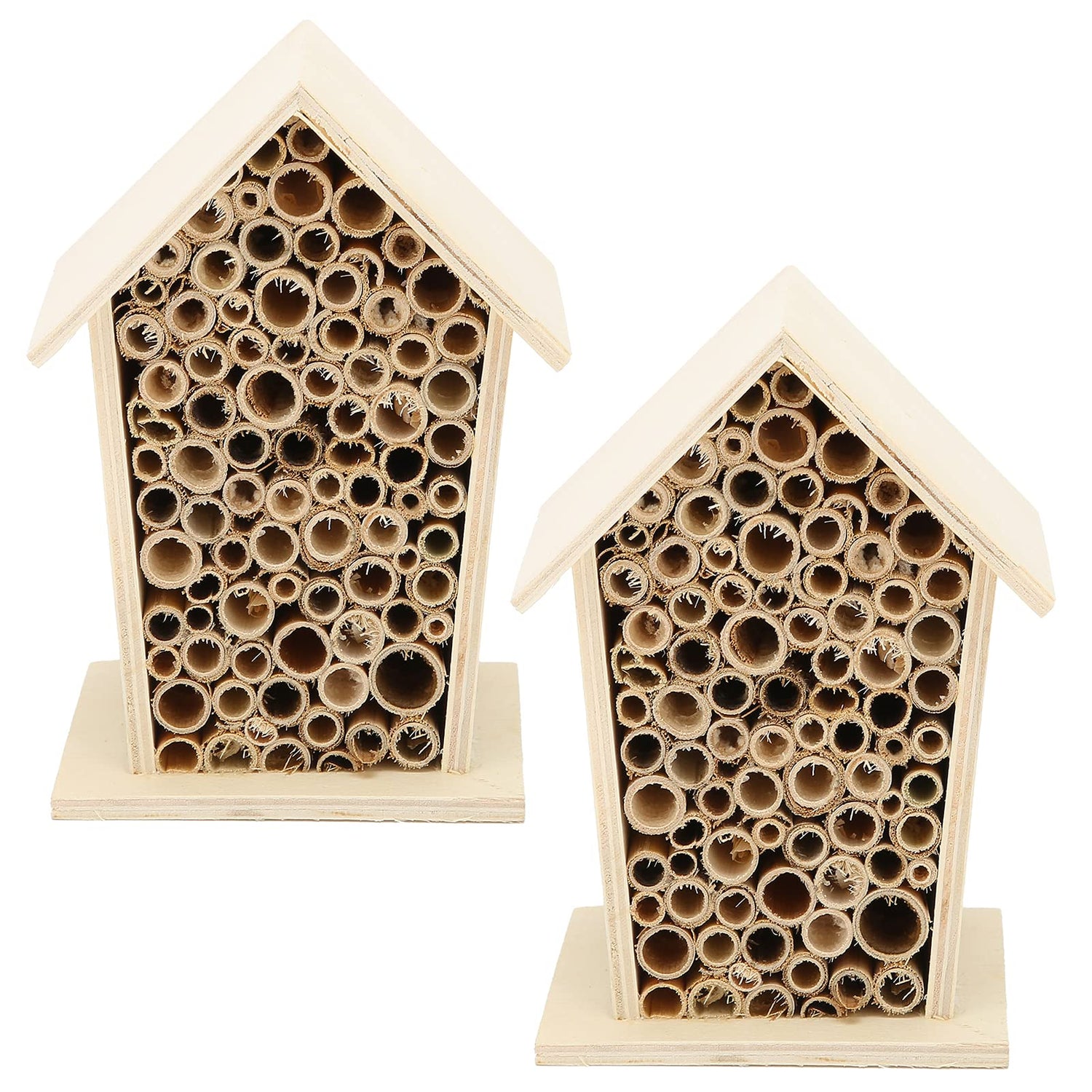 Native Hive Wooden Bee House, Natural Handmade Wooden Bee Box Habitat with Bamboo Tubes,Insect House Shelter for Attracting Peaceful Bee Pollinators (2PCS)