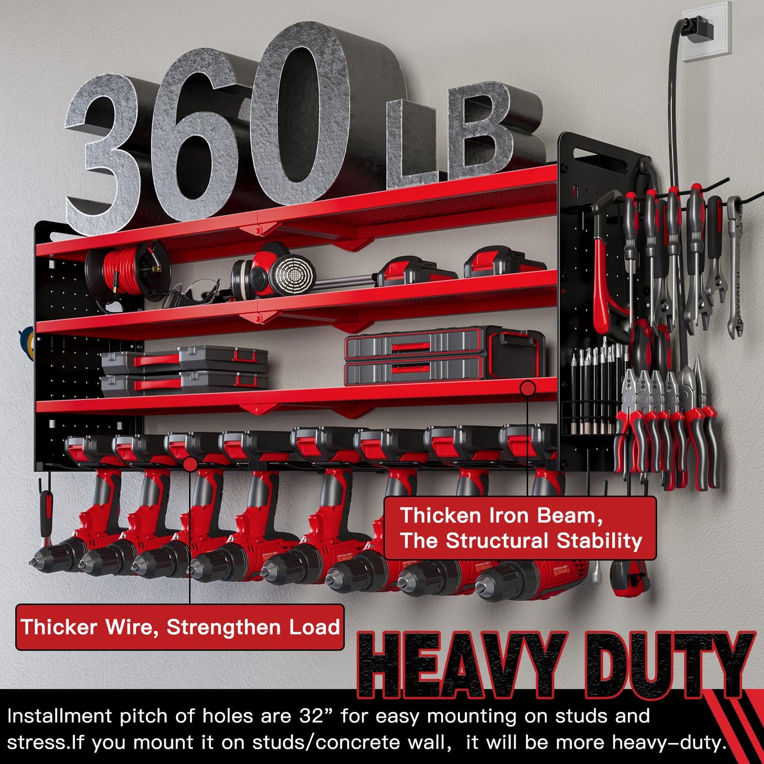 NattyDot Power Tool Organizer Wall Mount with Charging Station,Cordless Tool Organizer 8 Drill Holder, 4 Layer Storage Rack for Garage Organization,Tool Holder with 8 Outlet Power Strip (Red)