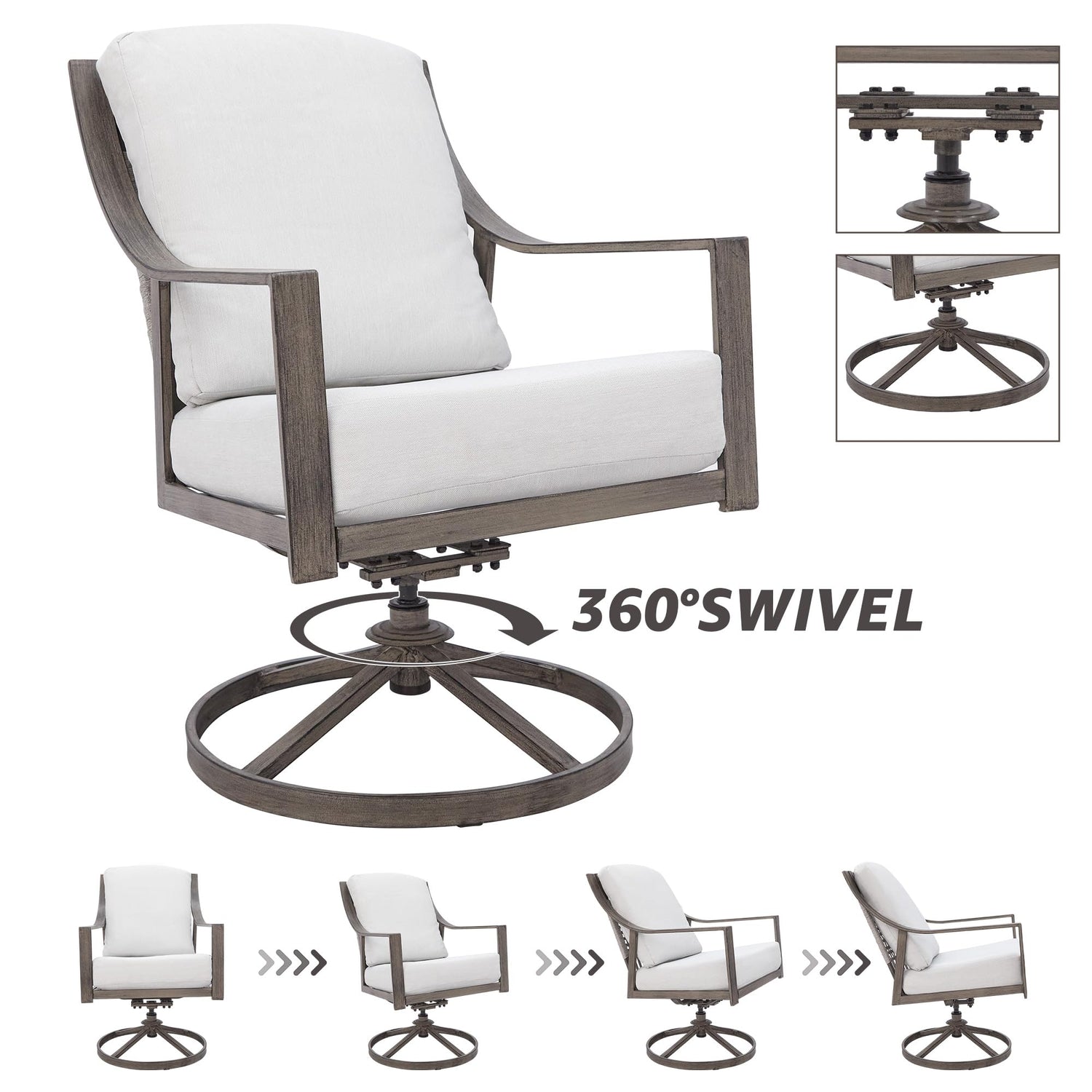 - [360°Swivel & Rocker Dining Chair]: The round, swivel base, and wide seat design make the chair more stable. 360 degrees of smooth rotation, easy to turn on the seat, sitting for a long time, waist and legs can move. It's good for getting the blood circulating. 15-degree gentle rocking motion offers ideal relaxation. You can enjoy your daily leisure time in any position in this fully functional patio swivel chair.