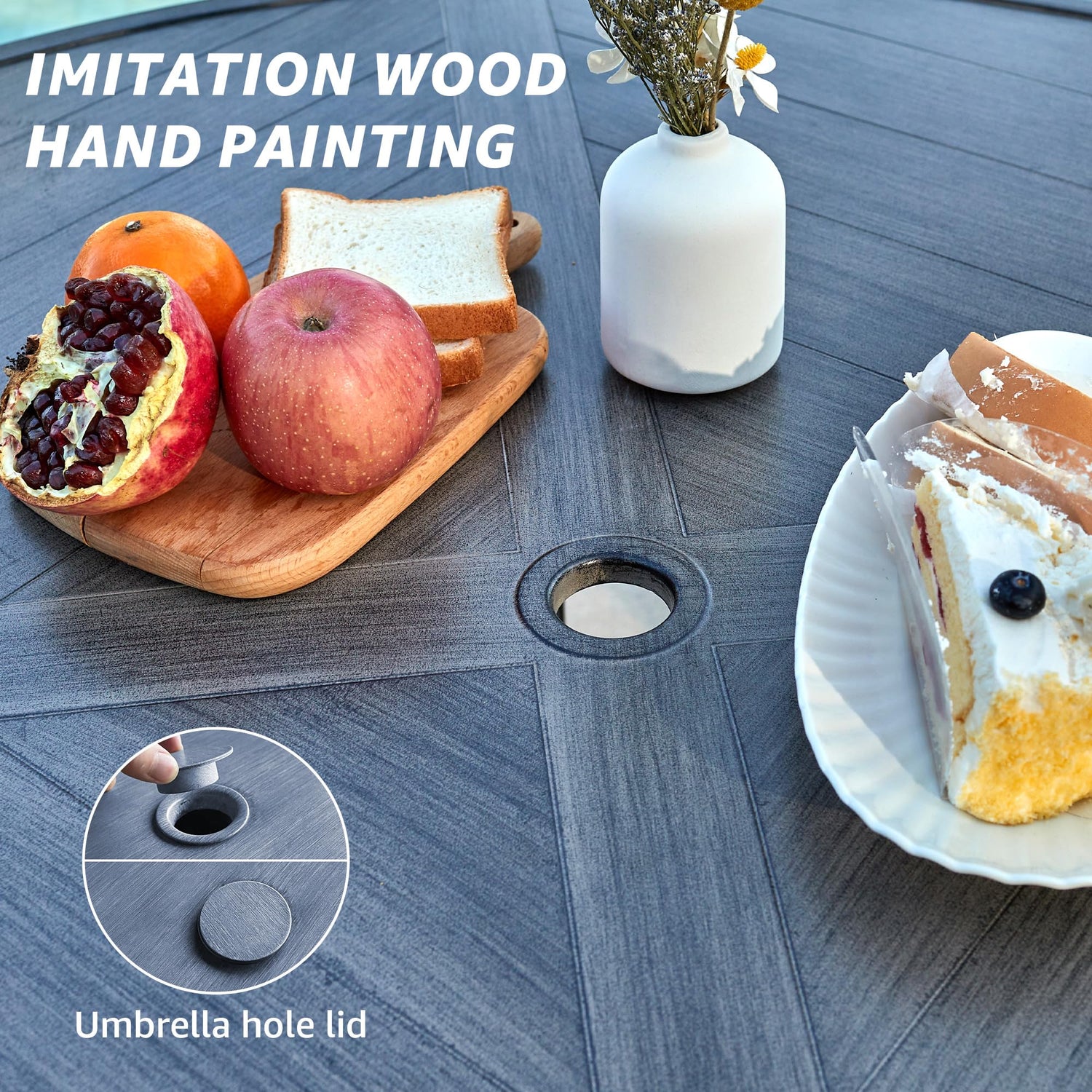 - [Imitation Wood Hand Finish]: The 38'' big round dining table and chairs are coated with a wood-like finish, providing a beautiful and natural aesthetic that blends seamlessly with outdoor environments.1.65'' umbrella hole and umbrella cover, you can choose whether to use the umbrella hole according to the weather, venue, party theme, covering the umbrella hole when not needed.