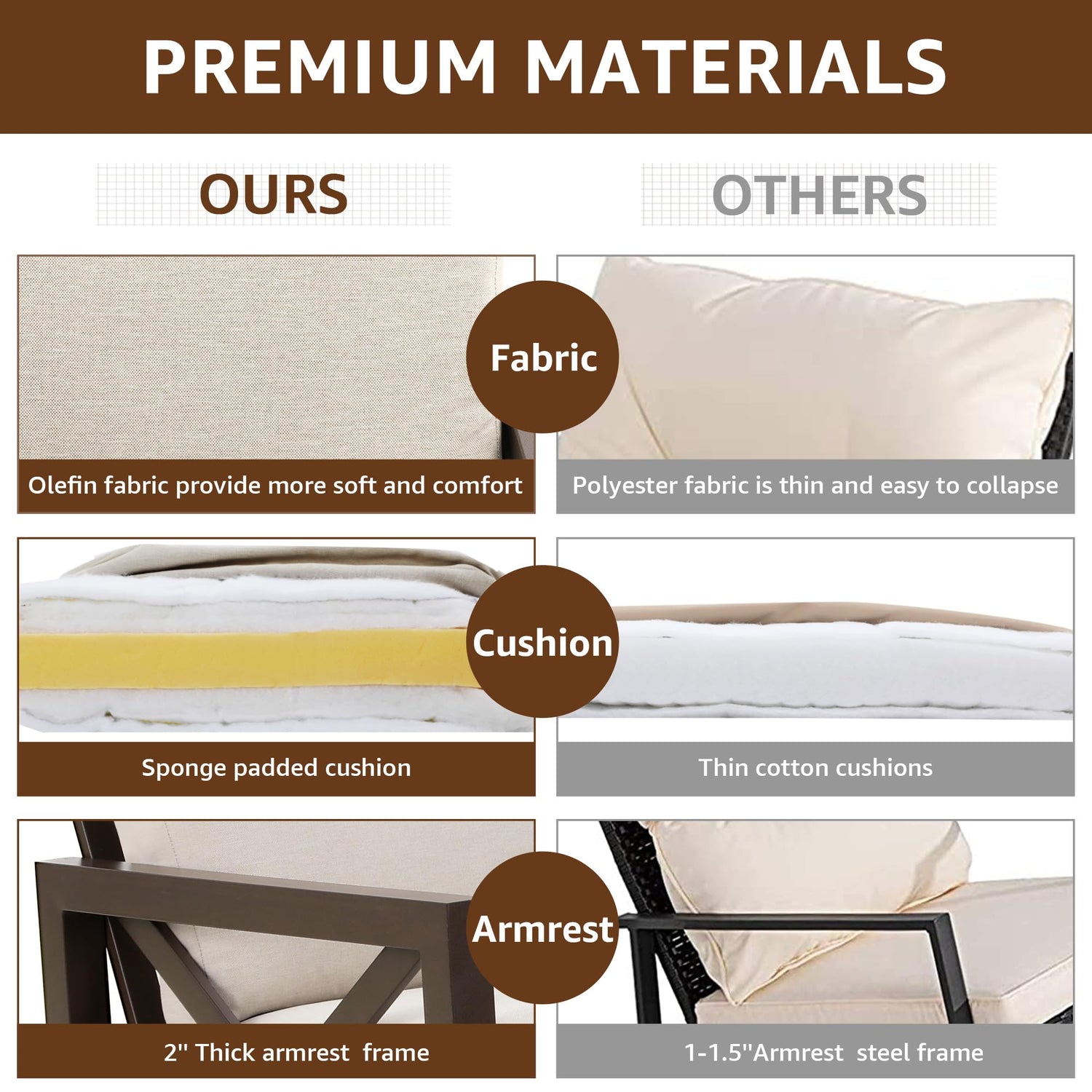 - Ergonomic Designed,Modern Unique Decor:with 105 °from unique designed X-shape handrail to backrest,outdoor furniture set provide ergonomic optimal comfort. Chairs and tables are made with thick,strong pipes to sit safe with 2 inch armrest (others1.5 inch only) and HIGHBACK Frame for more cozy. Outdoor Conversation Set has strong feet to protect the floor and increase the stability of furniture. The outdoor couch furniture is the best decoration for backyard, balcony,garden, deck and home.